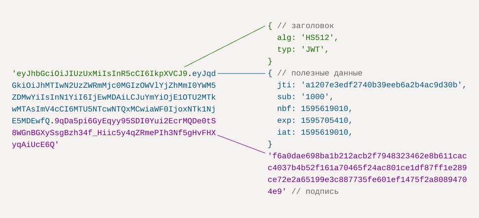 JWT — это строка из трех частей: заголовка, полезных данных и подписи.