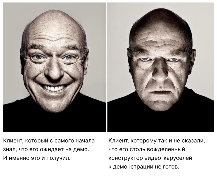 Здорово, когда команда понимает, чего ждет клиент от каждого конкретного демо. Великолепно если команда еще и может все эти ожидания оправдать. А если нет? В этом случае лучше сразу дать клиенту понять, что столь вожделенный конструктор видео-каруселей к демонстрации пока не готов — то есть, фактически, снизить ожидания еще на старте.