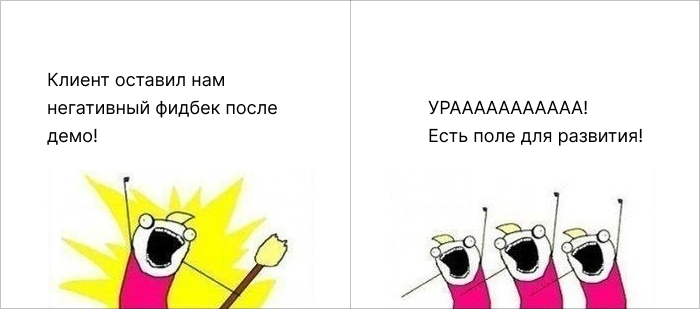 Отрицательный фидбэк — удивительная штука. Его довольно неприятно получать, но по части полезности он превосходит положительный. А еще с отрицательным фидбеком (если он по делу) зачастую проще работать: если клиент недоволен скоростью загрузки приложения — это значит, что скорость загрузки приложения нужно увеличить. Да, пример утрирован, но отрицательный фидбэк действительно довольно четко обозначает конкретную проблему, о которой вы могли и не догадываться до демо.