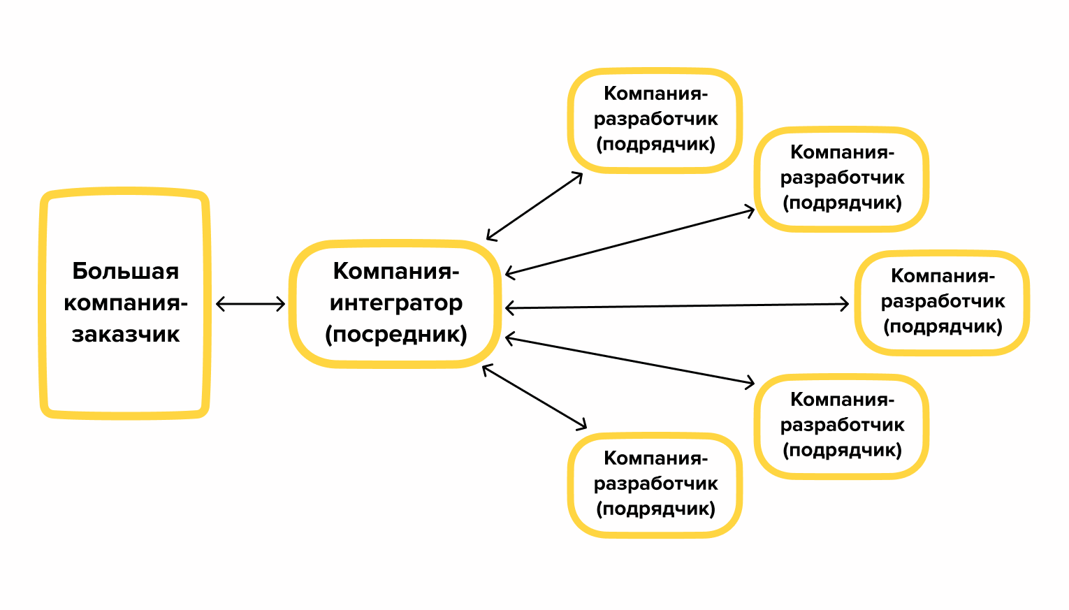 Вот как устроена работа через посредников. Заказчик общается с 2-3 компаниями-интеграторами. Те создают множество запросов в компании с «готовыми» разработчиками, настраивая поиск по грейду и навыкам. При этом задачи и цели, для выполнения которых бизнес решил нанимать исполнителей, если и раскрываются, то на уровне «создаем приложение для банка на микросервисной архитектуре». Этого, конечно, мало для понимания задачи, а без него тяжело подобрать правильного специалиста.