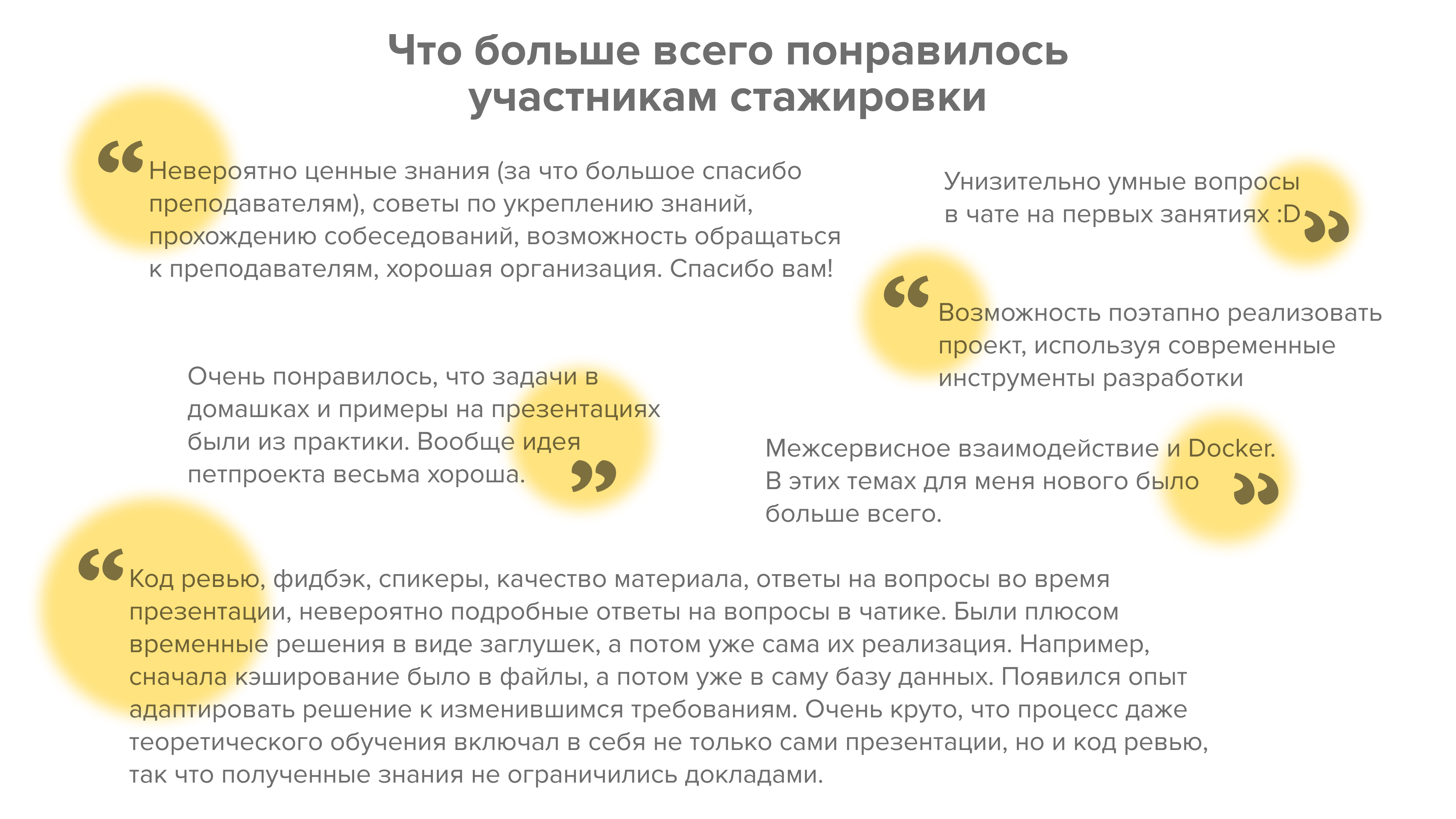 Проверять итоговые проекты стажеров мы закончили примерно в середине сентября, хоть и дедлайн их сдачи был 4 числа. Когда пришло время проверки, один из наших разработчиков-преподавателей ушел в отпуск, у другого была большая загрузка на проекте. Словом, пришлось успевать кое-как, поэтому процесс затянулся. Хоть и не быстро, но сделали все по совести: пяти лучшим студентам предложили интервью, остальным ребятам рассказали, что подтянуть, чтобы справляться лучше.