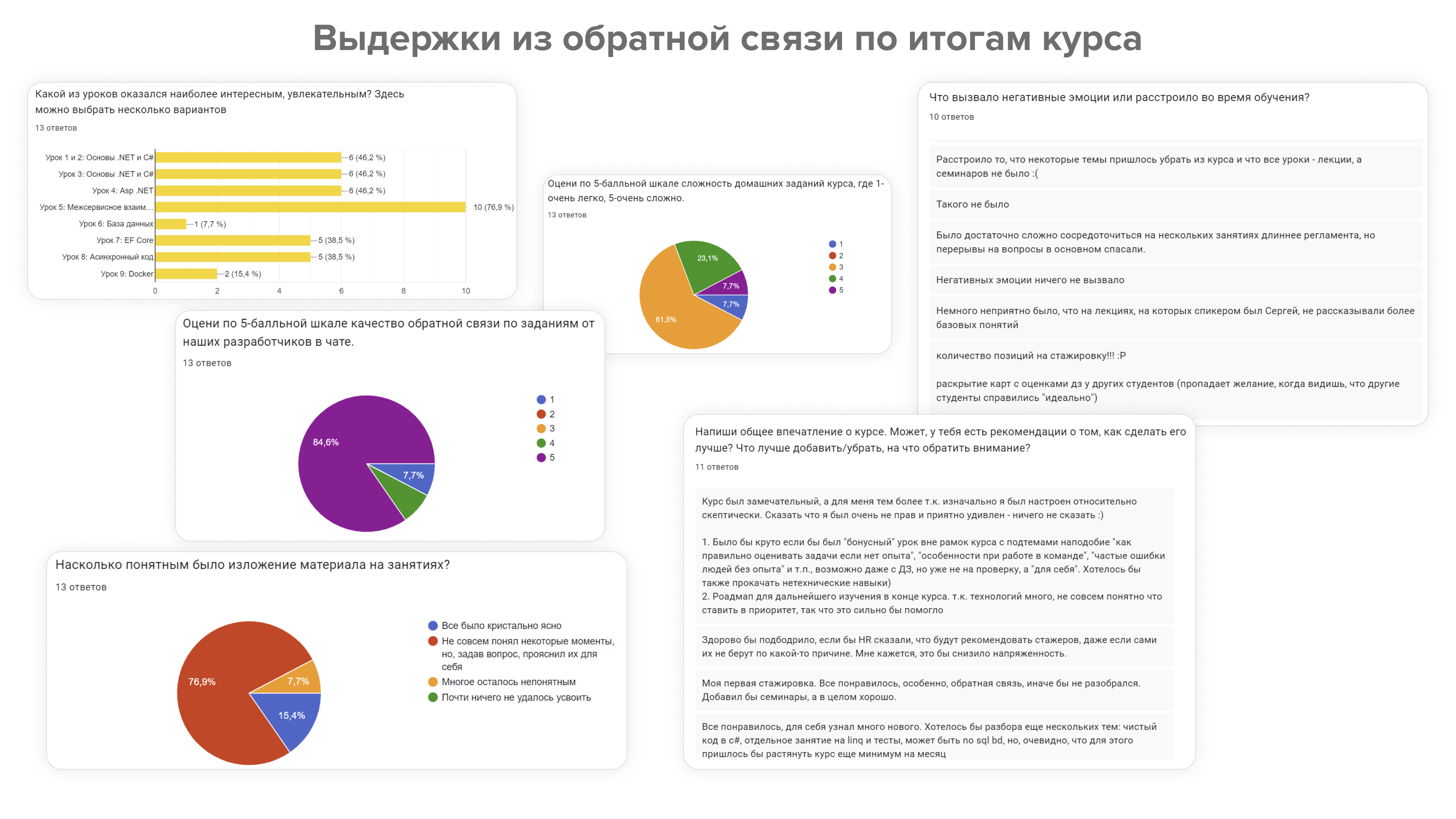Три раза за курс собирали обратную связь со стажеров через гугл-формы – после первого занятия, в середине и конце курса. Старались учитывать просьбы и пожелания.