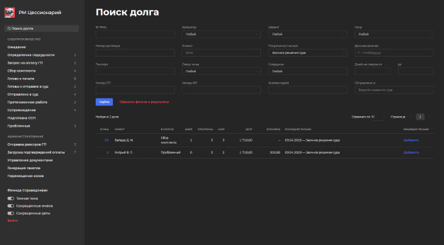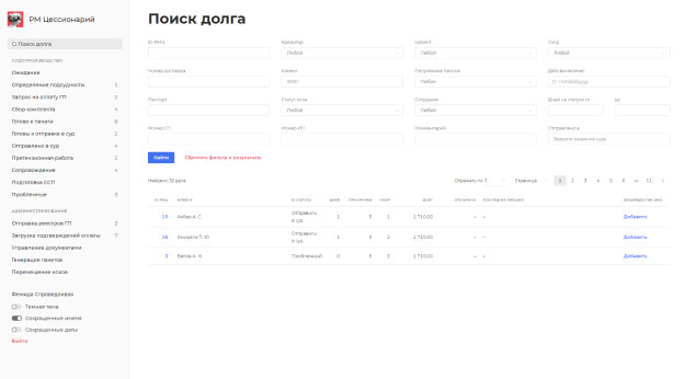 Отдельное внимание мы уделили тёмной теме. «Цессионарий» — это рабочий инструмент. Важно, чтобы сотрудникам отдела было комфортно пользоваться им в течение всего рабочего дня. Тёмная тема снижает нагрузку на глаза в вечернее время, когда естественного освещения не хватает.