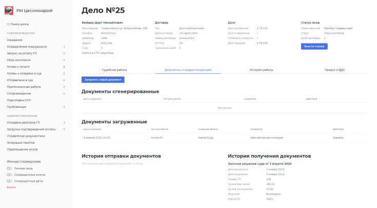 В компании есть отдел, который занимается истребованием долгов через суд. Вместе с аналитиками «Лайм Займ» мы создали для этого отдела рабочий инструмент — систему «Цессионарий».