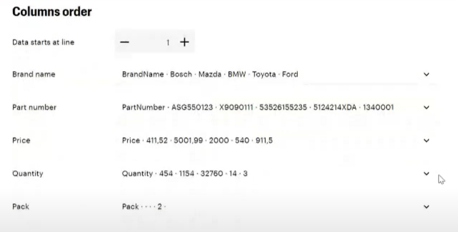 Seller Drive автоматически парсит данные из прайс-листов, но даёт пользователю возможность настроить парсинг, выставив нужные значения табличных колонок для извлечения данных. Например можно выбрать, с какой строки в таблице начинаются необходимые данные, чтобы система не включила в парсинг названия колонок вместо товарных данных.