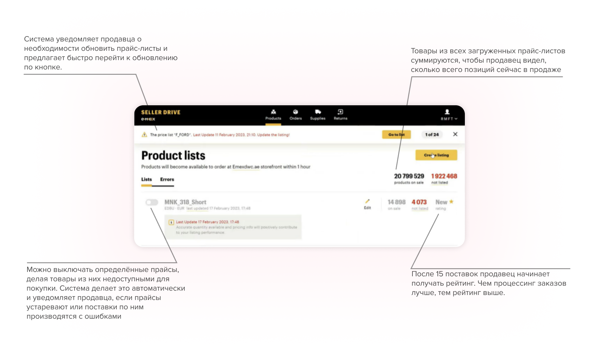 Нам предстояло создать новую версию Seller Drive взамен той, что существовала в компании последние 10 лет и никак не обновлялась 7 из них. Нужно было подстроить Seller Drive под актуальные бизнес-процессы Emex DWC и их технологическую экосистему.