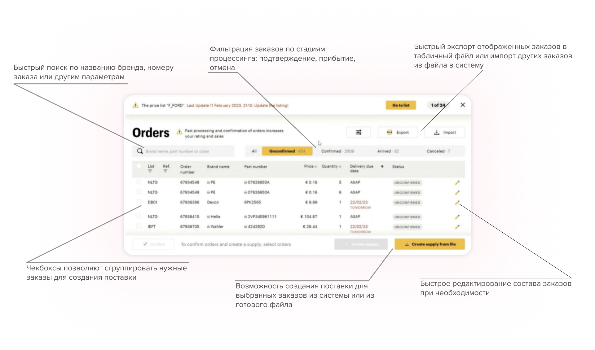 Товары из загруженных в Seller Drive прайс-листов попадают на маркетплейс, где покупатели могут их заказывать. Заказы после оформления отображаются в ЛК поставщика. Там их можно обрабатывать и процессить. Чем быстрее поставщик обрабатывает заказы, тем выше становится его рейтинг, который видят покупатели на маркетплейсе.