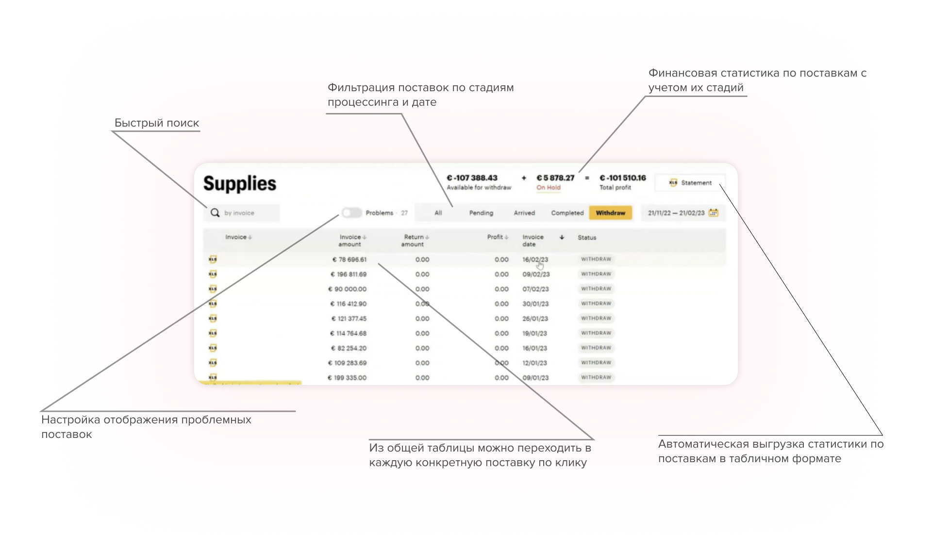 Поставщик группирует заказы и создаёт файлы поставок, которые аккумулируются на соответствующей вкладке. По мере осуществления поставок их статус обновляется. Интерфейс этой вкладки, как и предыдущих, визуально напоминает таблицу и предоставляет возможности фильтрации и перехода к конкретным поставкам. Это удобство для пользователя: в случае неполадок с поставками, легко выявить, в чём именно дело.