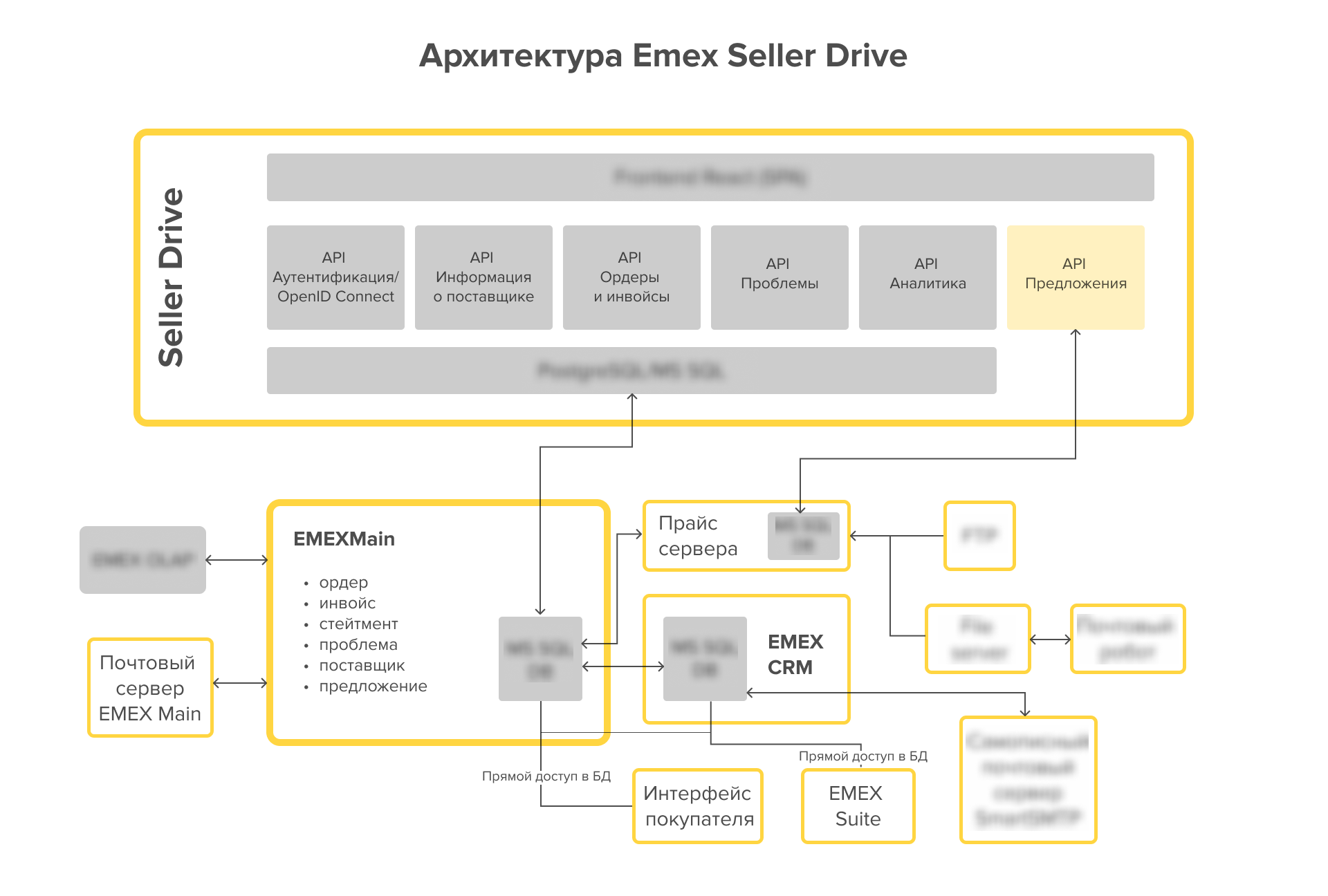 Стек технологий Seller Drive согласован со стеком российского подразделения Emex, чтобы поддерживать и дорабатывать системы одной командой.