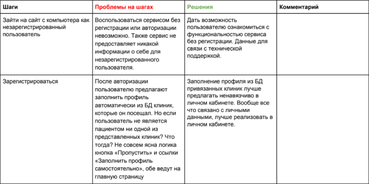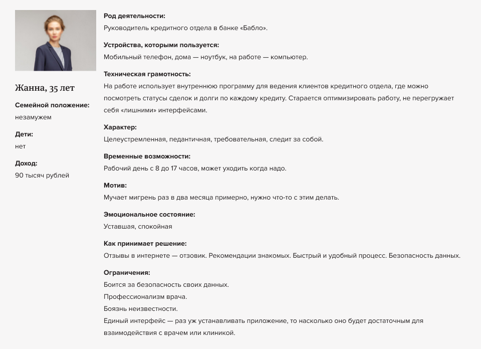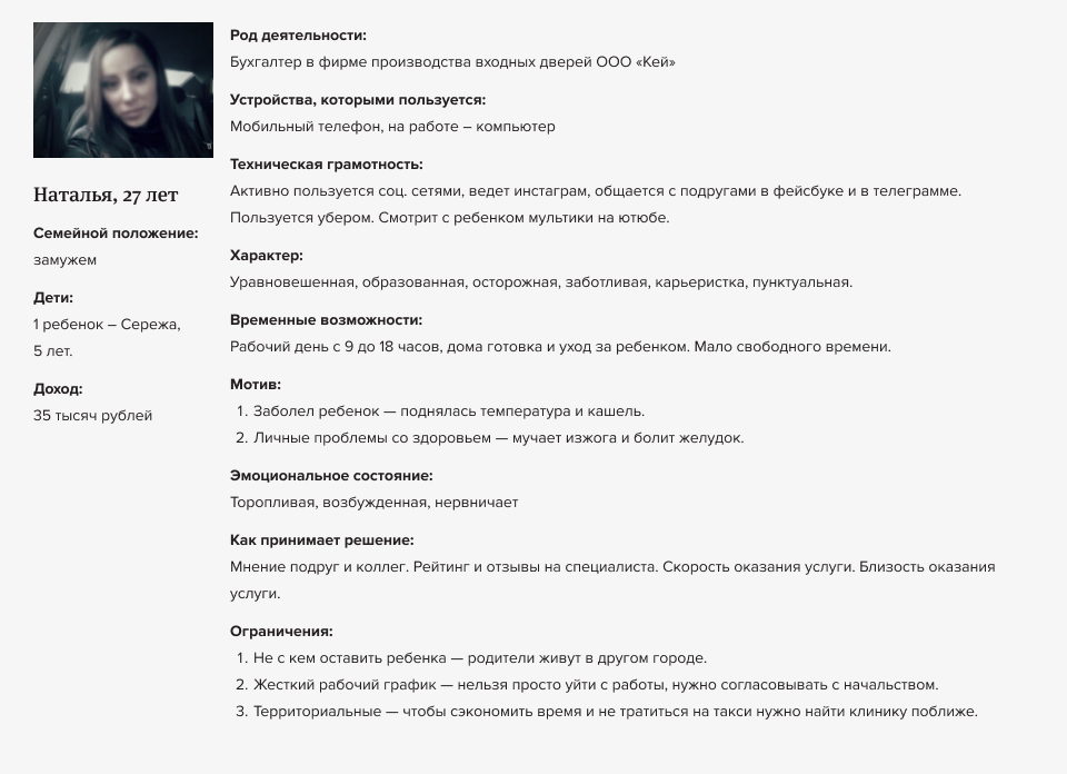 В итоге у нас получился большой документ-досье на наших персонажей. Мы знали о них всё! Их характер, семейное положение, какими устройствами они пользуются, насколько технически-подкованы, какие имеют ограничения и как принимают решения при выборе клиник и врачей.