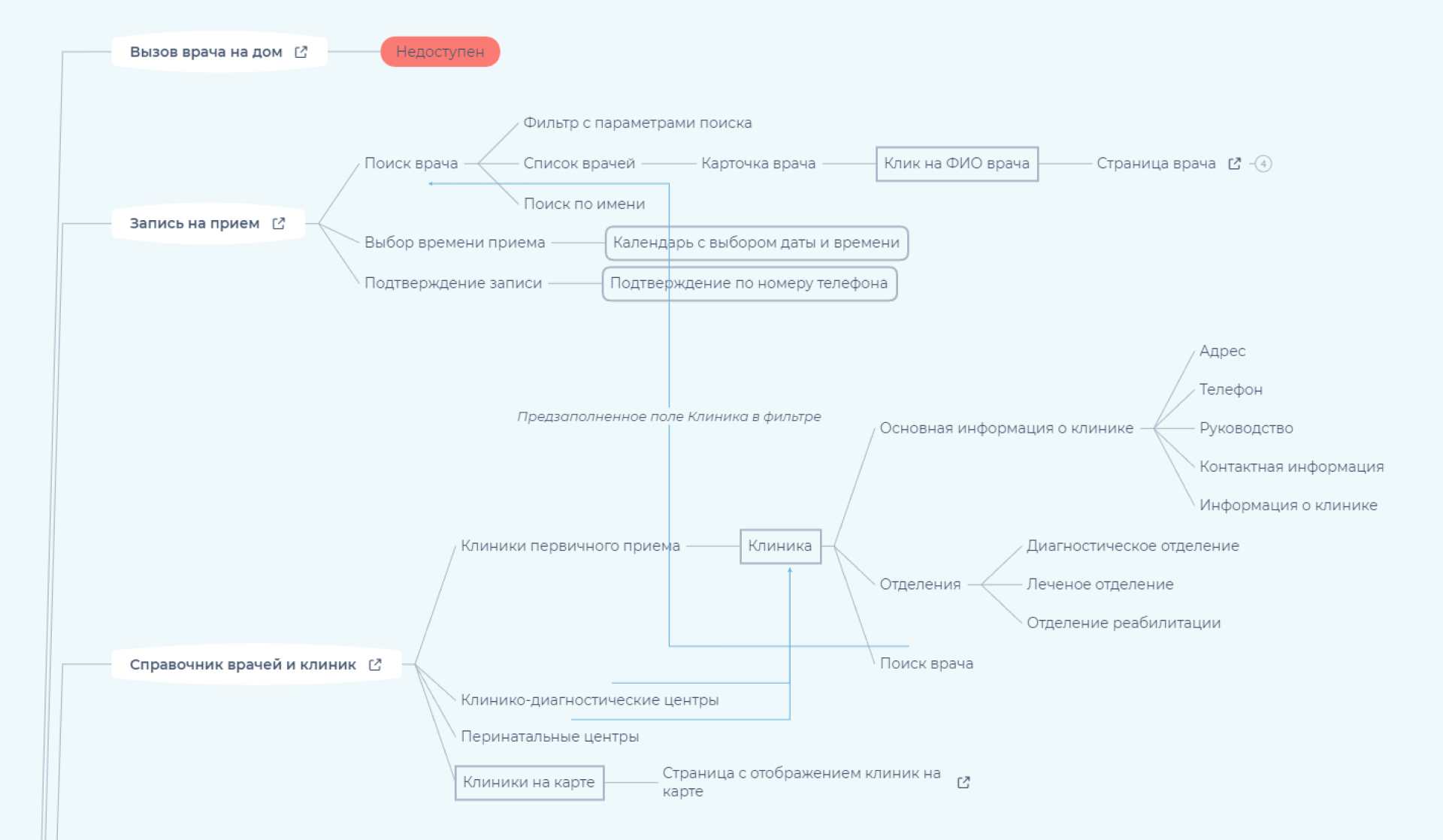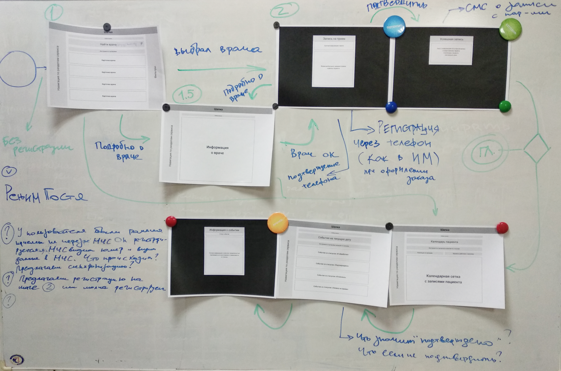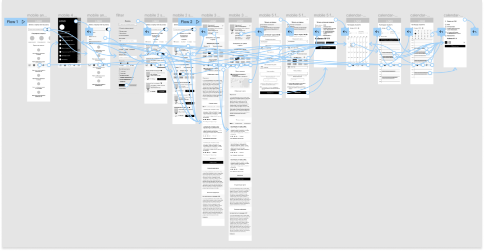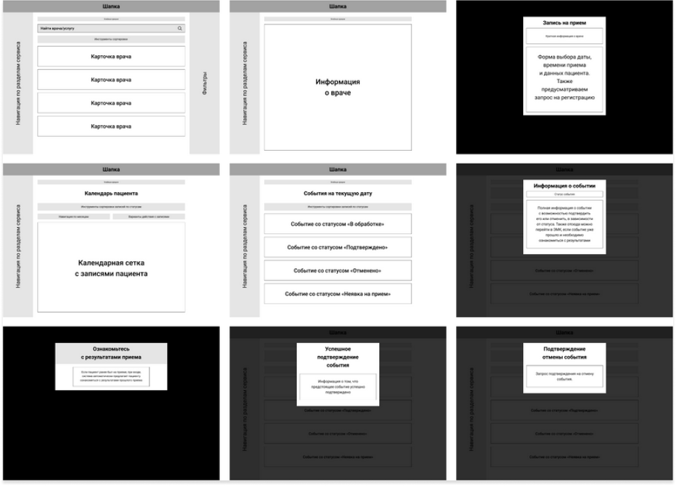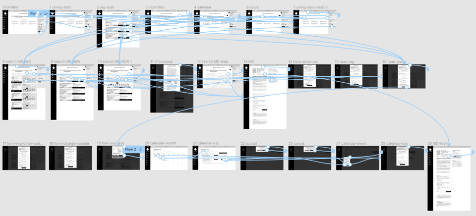 На этом этапе нам важна была не эстетическая, а смысловая составляющая экранов: как они связаны между собой, куда ведут пользователя и как помогают достичь цели — записаться к врачу.