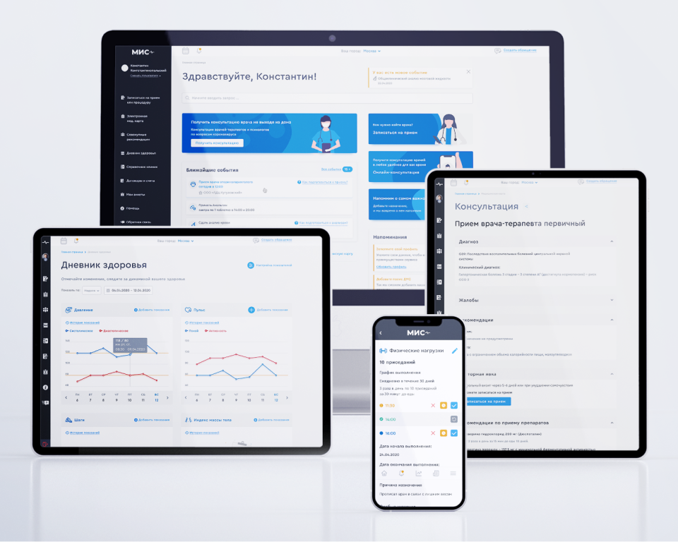 «Медицинская информационная система» (далее — МИС) — это приложение для врачей и пациентов. В МИС пациенты могут записаться на прием к врачу, ознакомиться со своей медицинской картой, узнать результаты анализов и посмотреть назначения. Также в приложении есть дневник здоровья, который помогает отслеживать важные жизненные показатели (вес, пульс, уровень сахара и т.д.) и напоминает, когда нужно сделать новое измерение.