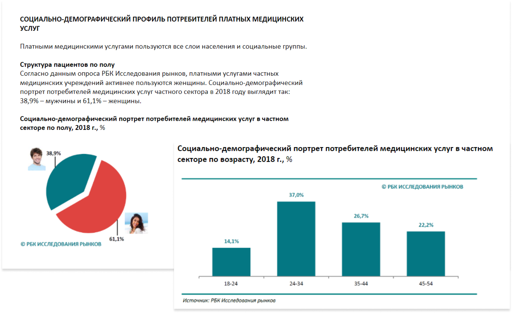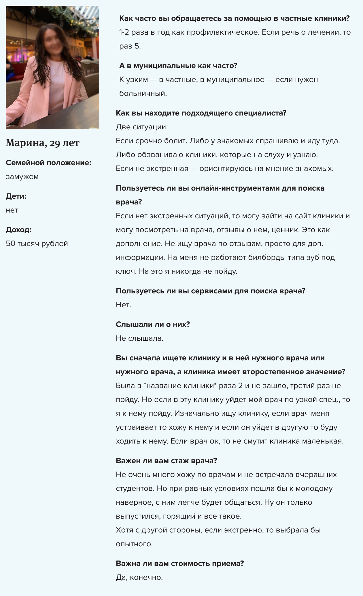 Закончив с анализом конкурентов, мы приступили к детальной проработке портретов пользователей МИС. Для этого мы еще раз обратились к исследованию ЦА от «ФармАльфы» и провели несколько интервью с людьми, которые пользуются услугами частных клиник.