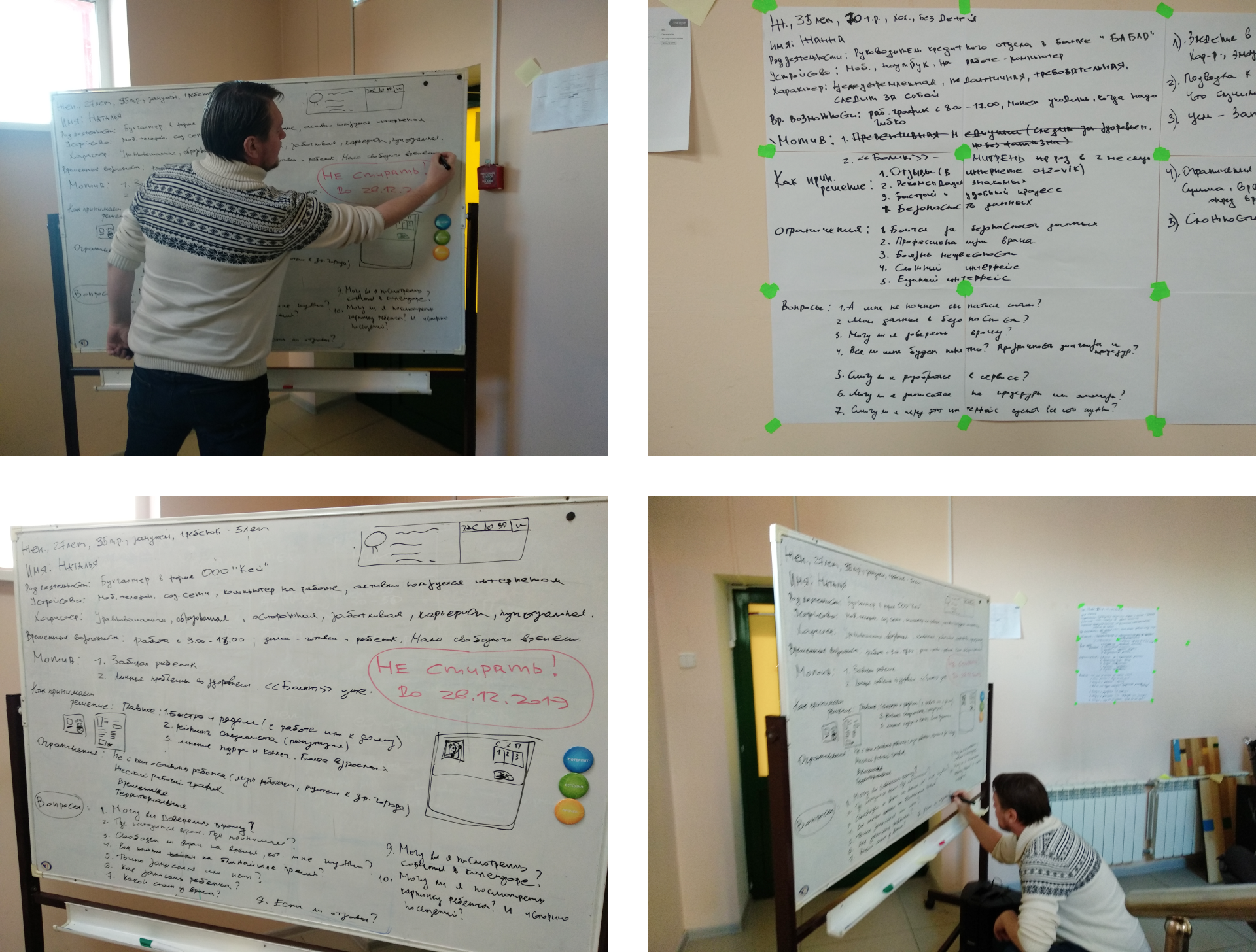 Затем мы спрятались от коллег в переговорке и начали работать над портретами пользователей. Каждого персонажа старались описывать максимально детально — кто эти люди, сколько им лет, где они работают и сколько получают, что и при каких обстоятельствах вынудило их обратиться к врачу.