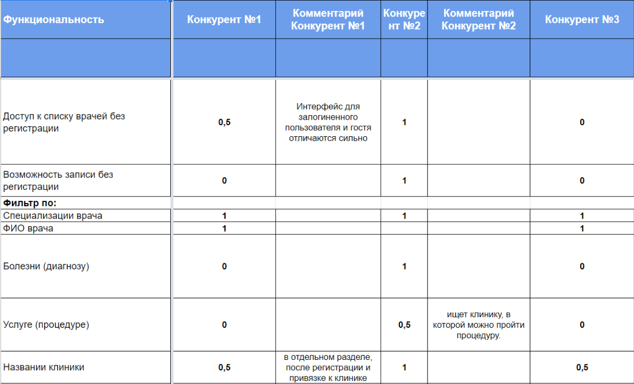 Мы отобрали несколько приложений с интерфейсом поиска врача, выписали в таблицу всю их функциональность и сравнили между собой. Оценивали и существующий интерфейс МИС.