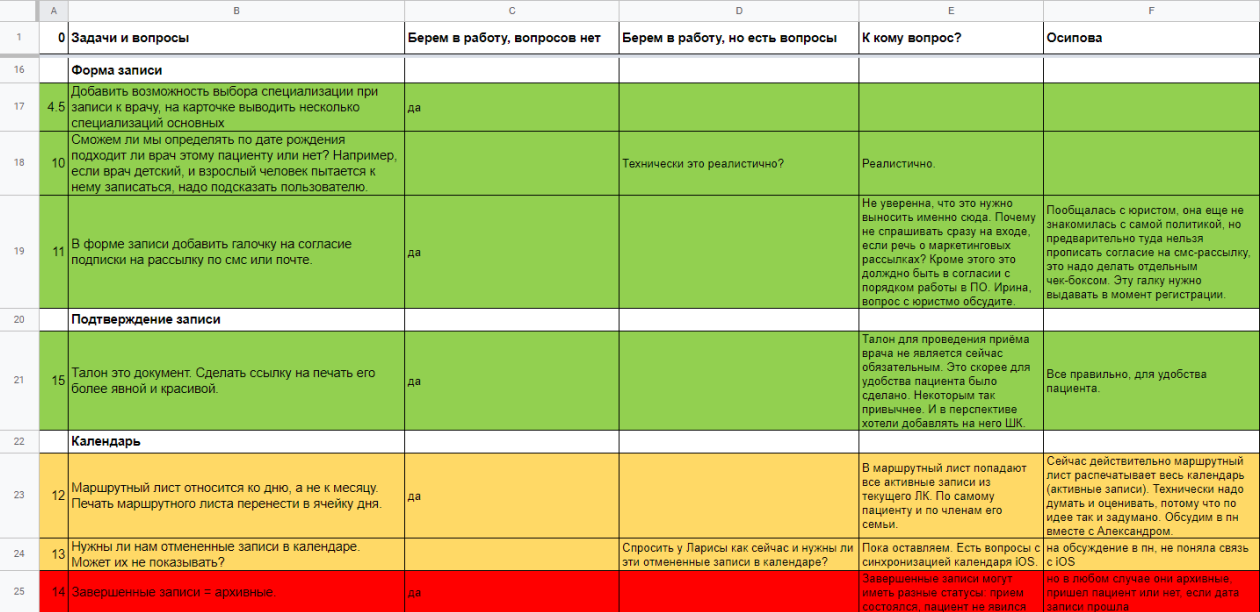 Все замечания, предложения и пожелания выписывали в отдельную таблицу, ранжировали по приоритетности и отмечали готовность методом светофора: