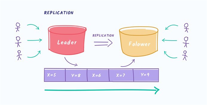 Поскольку Kafka гарантирует консистентность, для читателей сообщение будет видно только после записи по всем репликам. Репликация происходит отдельно для каждой партиции в топике.