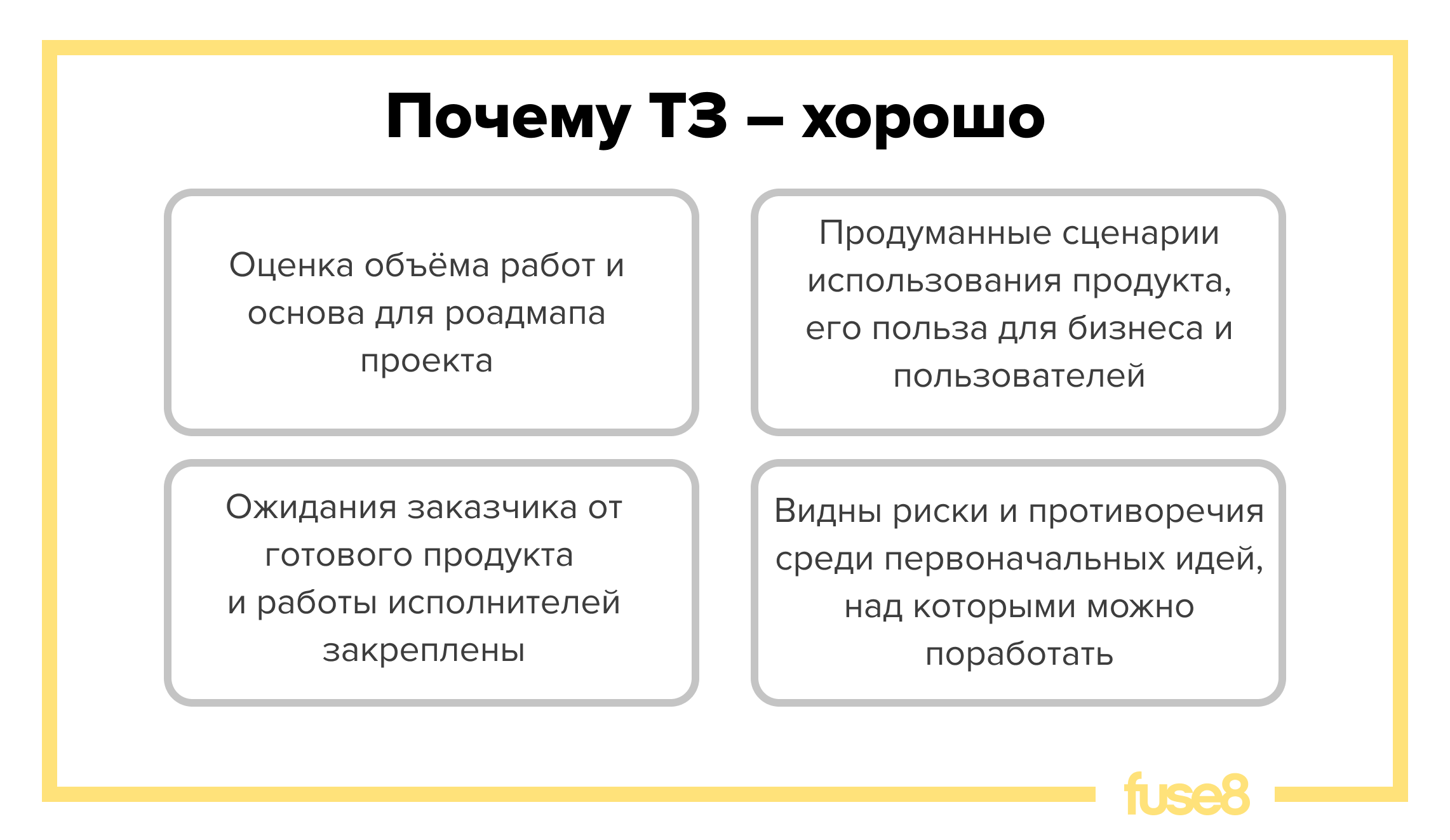 Но не поймите неправильно – наш подход удовлетворяет требованиям ГОСТ 34 на разработку ТЗ, просто улучшает его и делает менее бюрократическим. То есть мы меняем форму и упрощаем восприятие, а не бездумно вырываем куски из привычной для многих документации. А еще сокращаем время на онбординг команды и быстрее стартуем все то, что идет после проектирования продукта. Получается win-win.
