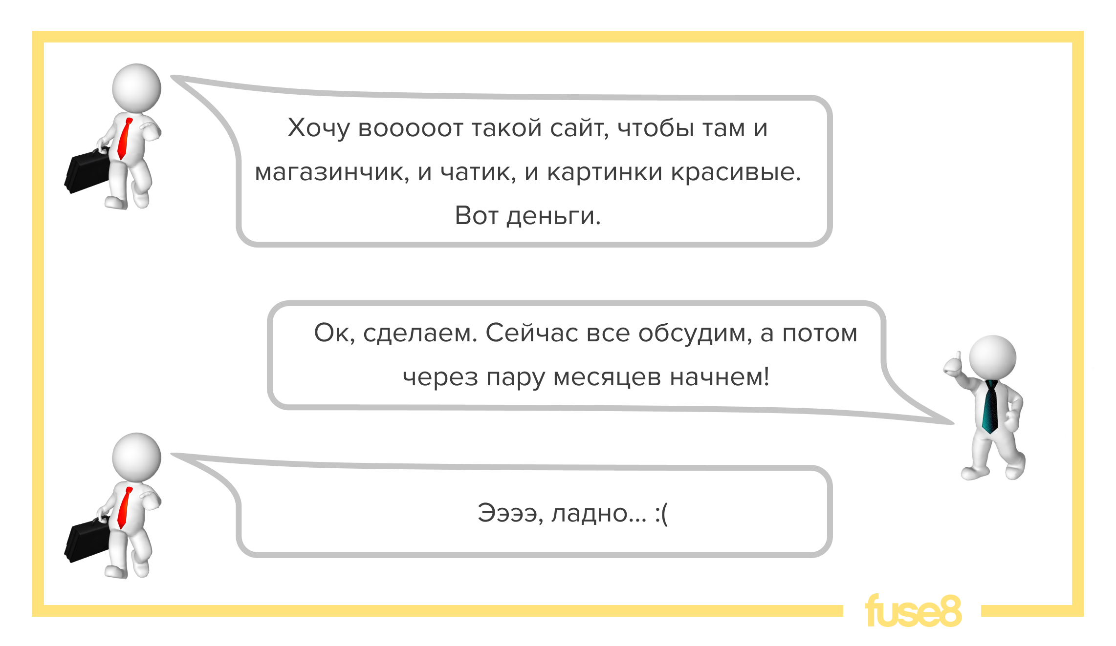 Дальше просто факт: для крупного проекта с разработкой от 6-ти месяцев составление документации занимает 2-3 месяца без учета верхнеуровневого описания требований. Еще один факт: бизнес покупает у нас не ТЗ – он хочет работающий продукт. При этом процесс создания ТЗ оплачивается. Заказчик все это время в ожидании. То есть, он знает, что исполнители заняты делом, вникают, но результат «пощупать» пока нельзя. Находиться в таком подвешенном состоянии не нравится никому.