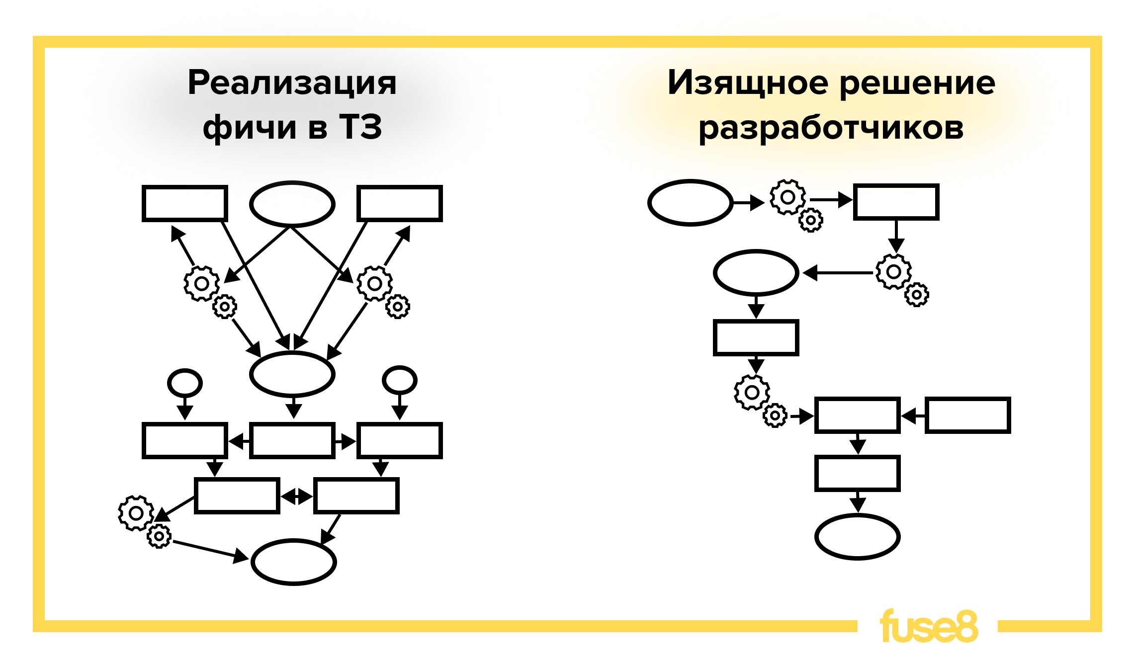 Теперь о том, что внутри. Сила ТЗ в его детализации. Грубо говоря, по хорошему ТЗ команда без лишних вопросов может запилить работающий продукт. Но это фантазии. Во-первых, потому что нельзя идеально детализировать ТЗ. Во-вторых, потому что сильной команде разработки не нужно, чтобы за нее решали, как реализовать «вот эту вот фичу» – она сама придумает изящное решение. А раз так, то время (и деньги) на детальные описания тратится зря.