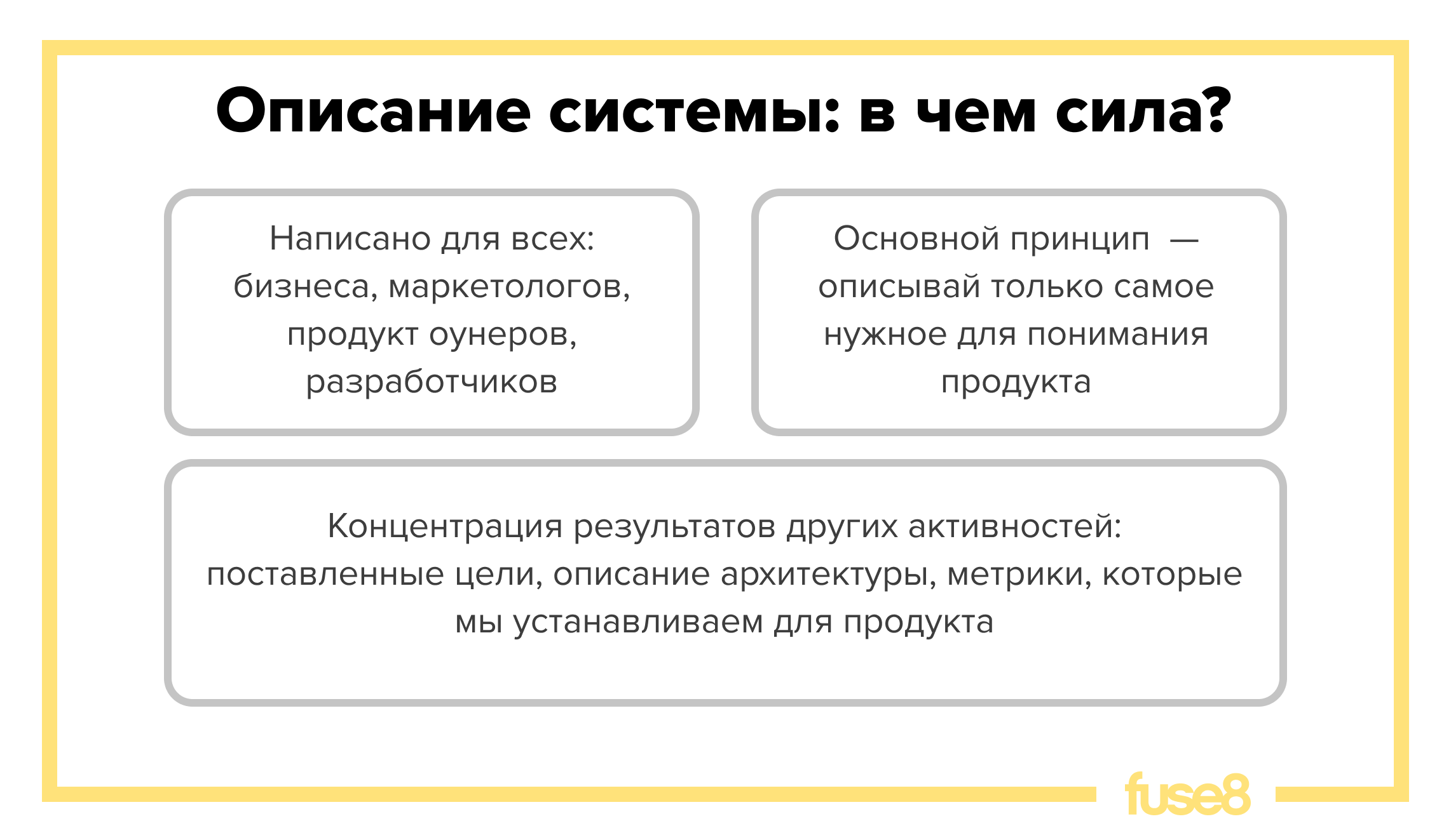 Мы собираем требования почти как при разработке ТЗ, но не углубляемся в детали реализации функциональности продукта, которую обсуждаем. Получается описание системы. Это документ, из которого бизнес понимает, какой продукт получится в итоге, а команда разработки может декомпозировать его по задачам, принять решения о реализации фич и стартовать разработку.