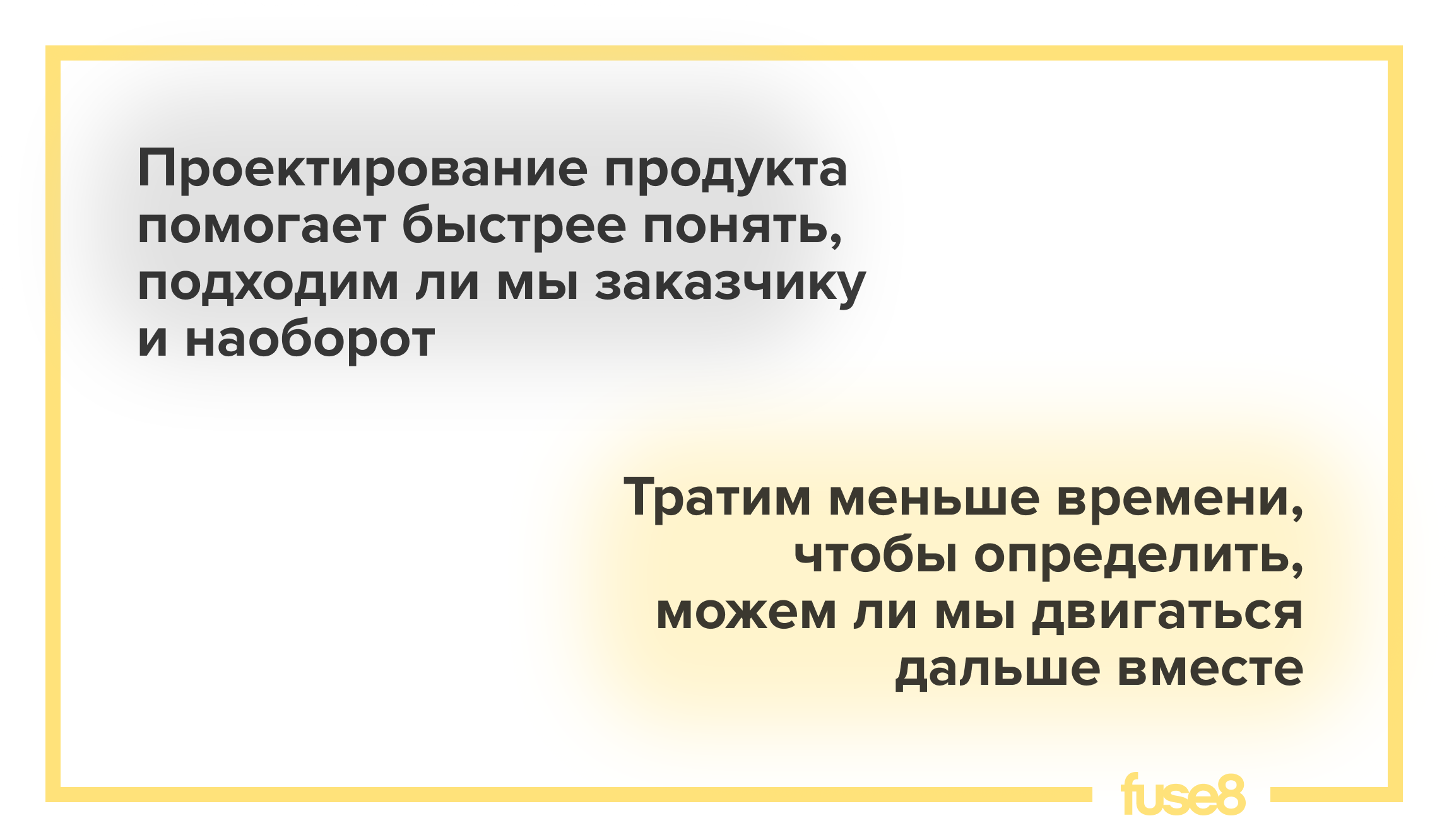 Вместо длительного сбора требований мы стали проводить продуктовое проектирование. Оно занимает не более 5 недель. Сначала примерно договариваемся с заказчиком о занятости на каждую неделю, потом уточняем план. Отвечаем в ходе исследования на вопросы: