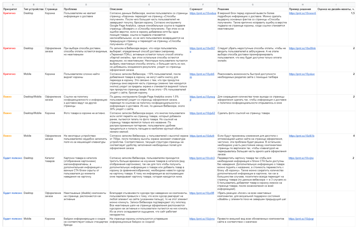 ΠΠΎΡΠ»Π΅ ΡΠΎΠ³ΠΎ, ΠΊΠ°ΠΊ ΠΌΡ Π·Π°ΠΊΠΎΠ½ΡΠΈΠΌ UX-Π°ΡΠ΄ΠΈΡ, ΠΊΠ»ΠΈΠ΅Π½Ρ ΠΏΠΎΠ»ΡΡΠΈΡ ΡΡΠΊΠΎΠ²ΠΎΠ΄ΡΡΠ²ΠΎ ΠΊ Π΄Π΅ΠΉΡΡΠ²ΠΈΡΠΌ ΠΏΠΎ ΡΠ»ΡΡΡΠ΅Π½ΠΈΡ ΡΠ°ΠΉΡΠ° Π² Π²ΠΈΠ΄Π΅ ΠΎΡΡΡΡΠ°. ΠΡΠΎ Π΄ΠΎΠΊΡΠΌΠ΅Π½Ρ Π² PDF ΠΈΠ»ΠΈ Π² Google Sheets. Π Π½ΡΠΌ ΠΌΡ: