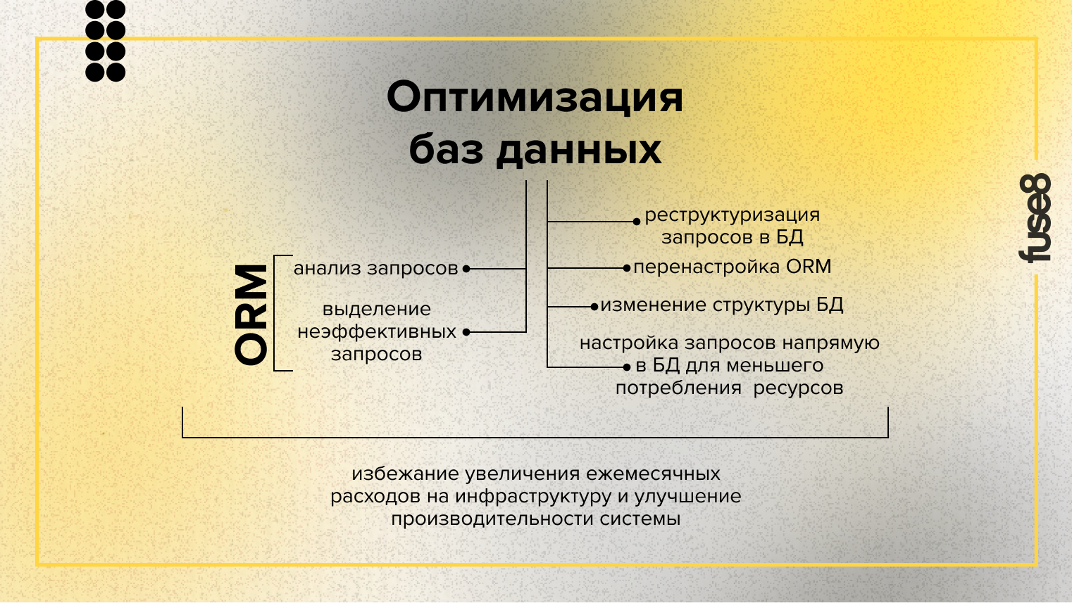 На проекте мы использовали ORM библиотеку, помогающую в объектно-ориентированном коде обращаться к базам данных (БД). Мы проанализировали запросы, которые генерировала библиотека и выделили неэффективные, где система берет из БД лишние данные или делает избыточные обращения к ней, не использует индексы.