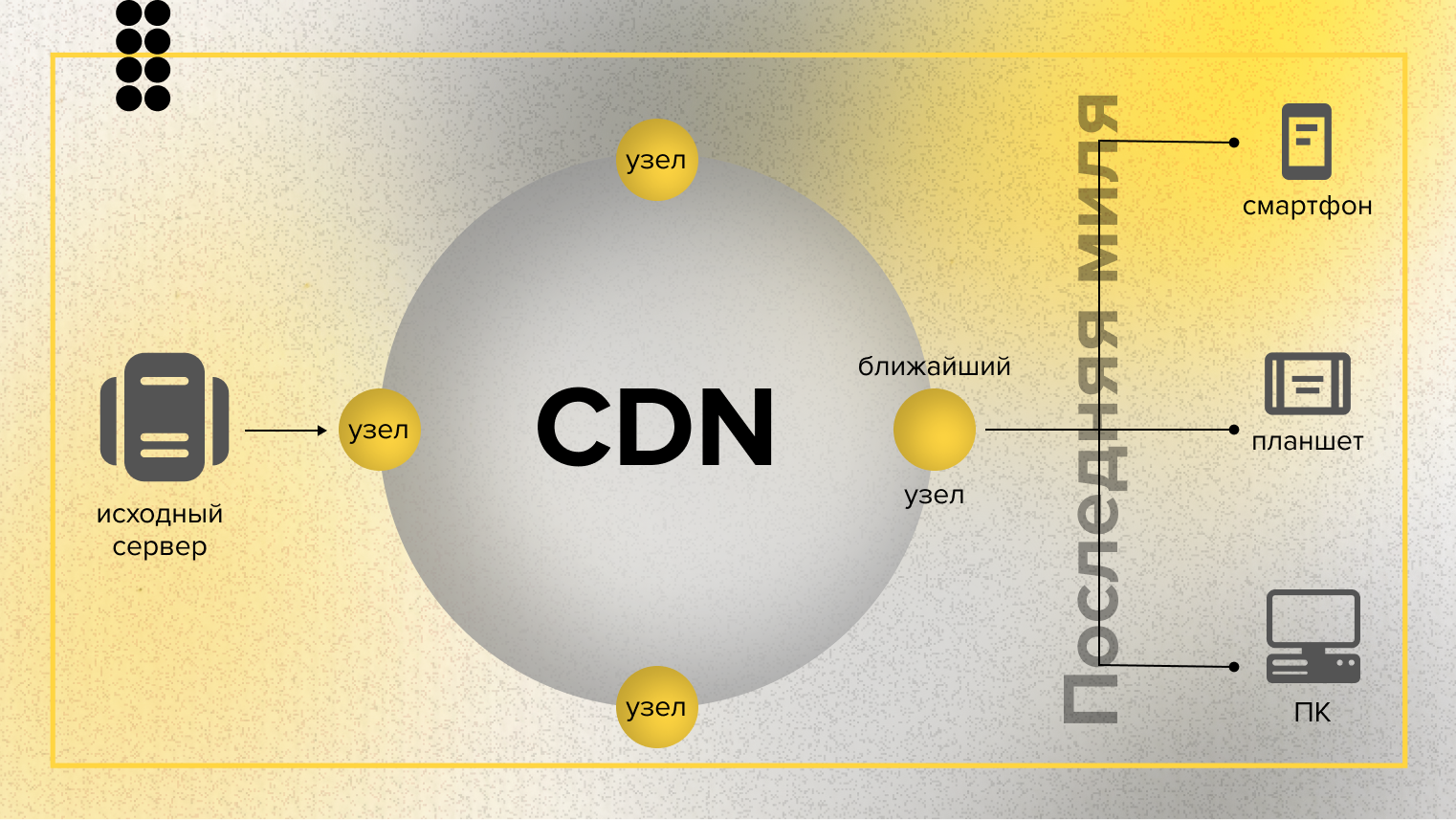 Второй обязательный элемент масштабирования любых публичных онлайн-проектов – это сеть доставки контента («content delivery network», CDN). Это сеть взаимосвязанных серверов, которая ускоряет процесс загрузки веб-страниц приложений с высокой нагрузкой за счет кэширования отдельных запросов на них.