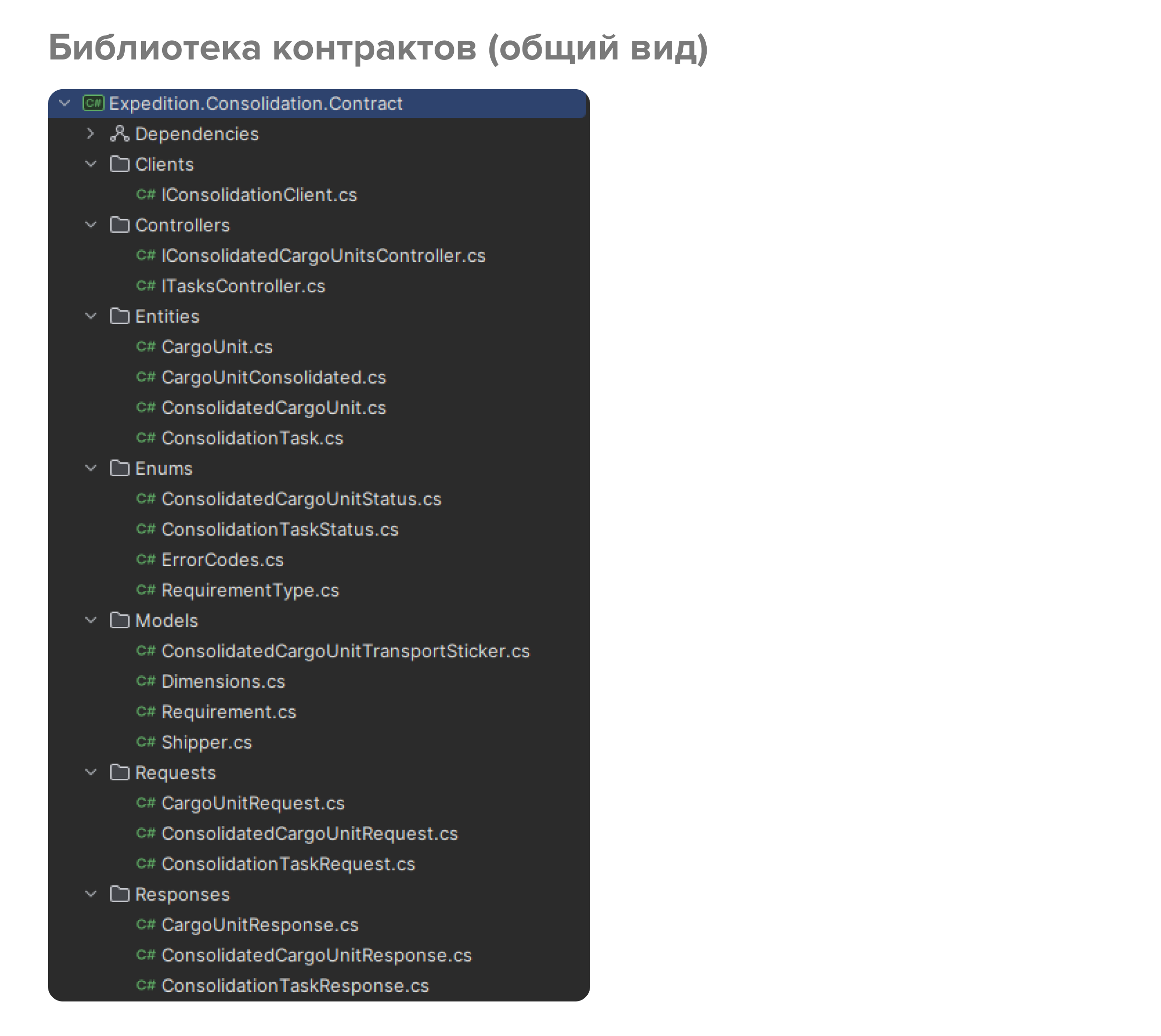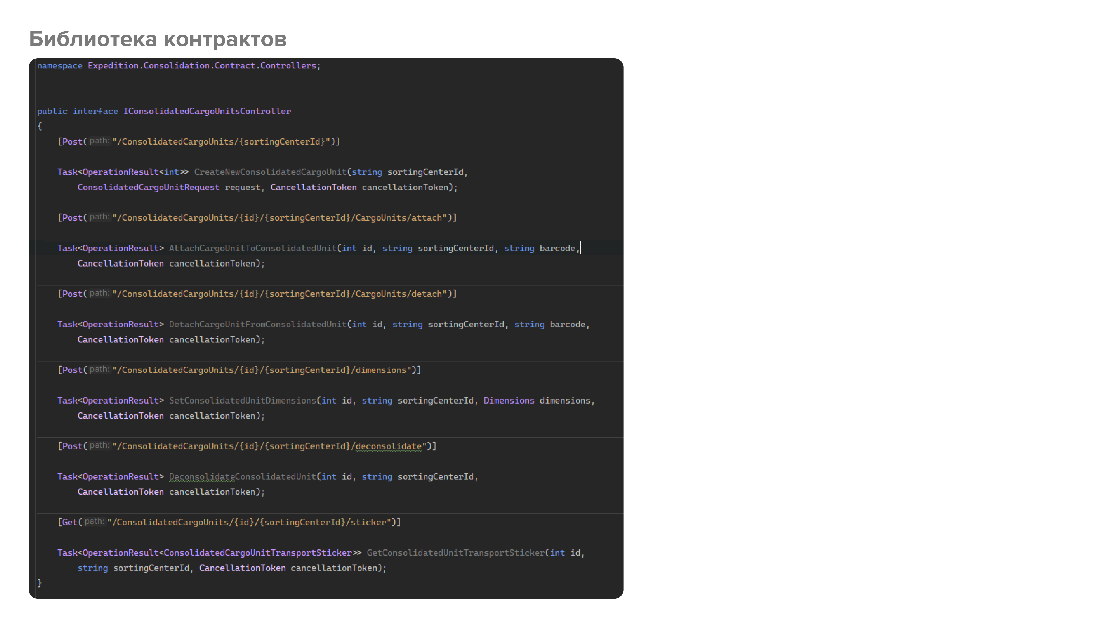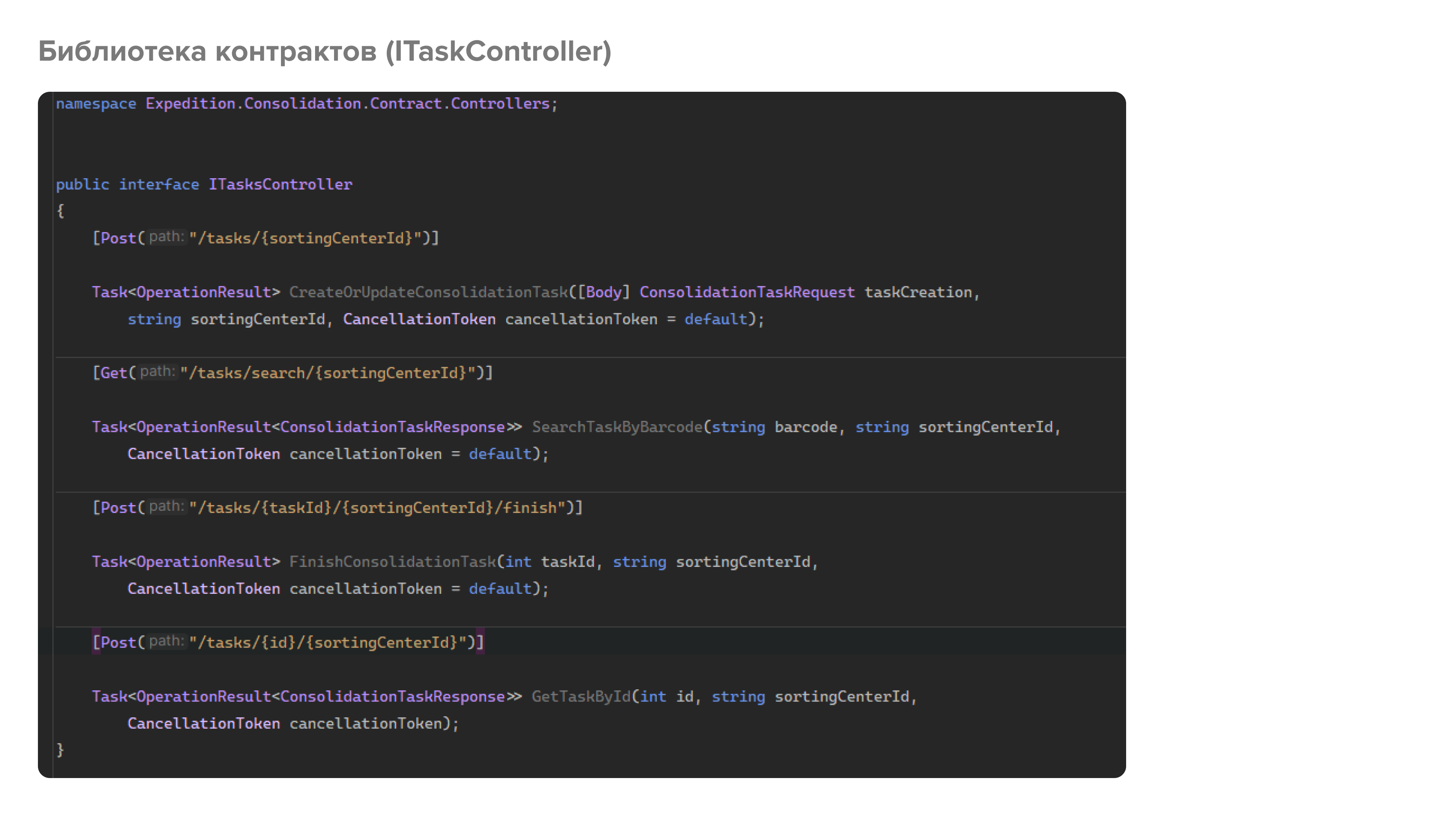 Например, в одной из библиотек у нас есть два интерфейса - ITaskController и IConsolidationCargoUnitsController. В них определены все необходимые методы, которые в дальнейшем будут реализованы как соответствующими контроллерами, так и клиентами. Поскольку для генерации клиентов мы используем библиотеку Refit, то здесь мы дополнительно определяем типы запросов и их маршруты с помощью атрибутов [Get(...)], [Post(...)] и т.д. Важно заметить, что это не ASP.NET атрибуты, а Refit. Соответственно, наша библиотека контрактов вообще может не иметь зависимости от ASP.NET.