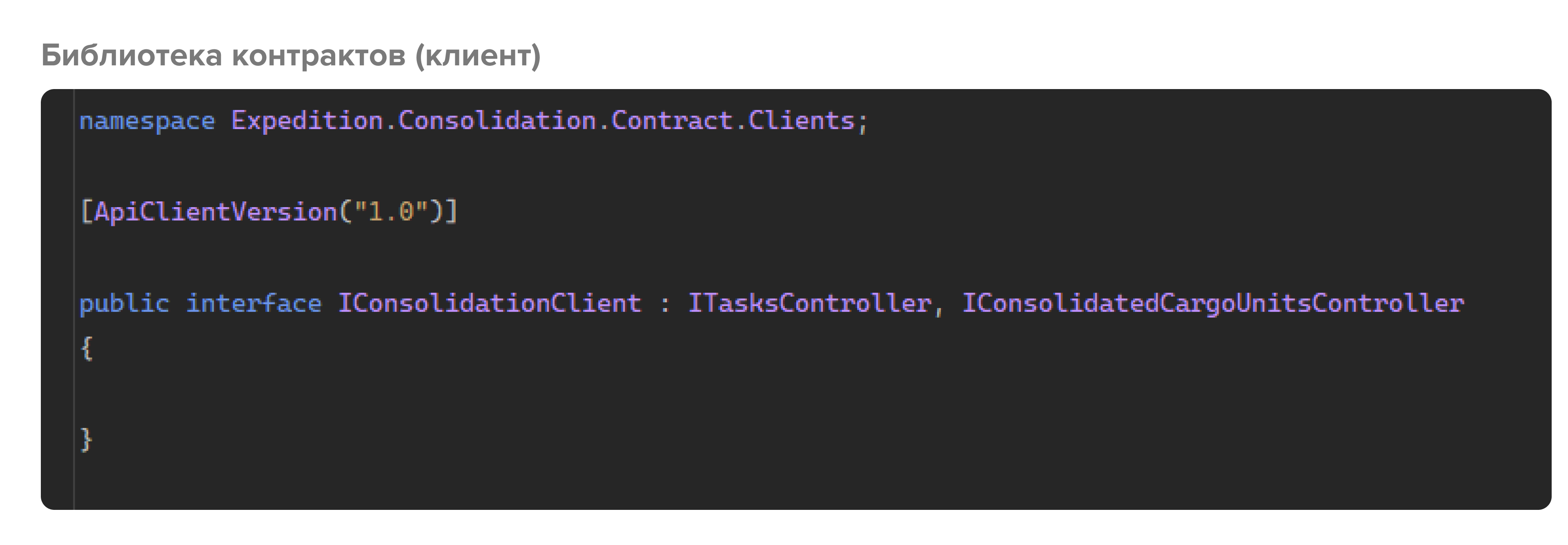 Далее описываем интерфейс клиента, который не содержит своих методов, а просто наследует все интерфейсы контроллеров, и помечаем его специальным атрибутом, реализующим версионность. Имплементация этого интерфейса (с помощью библиотеки Refit) и будет являться клиентом, которым пользуются внешние системы, чтобы взаимодействовать с ним.