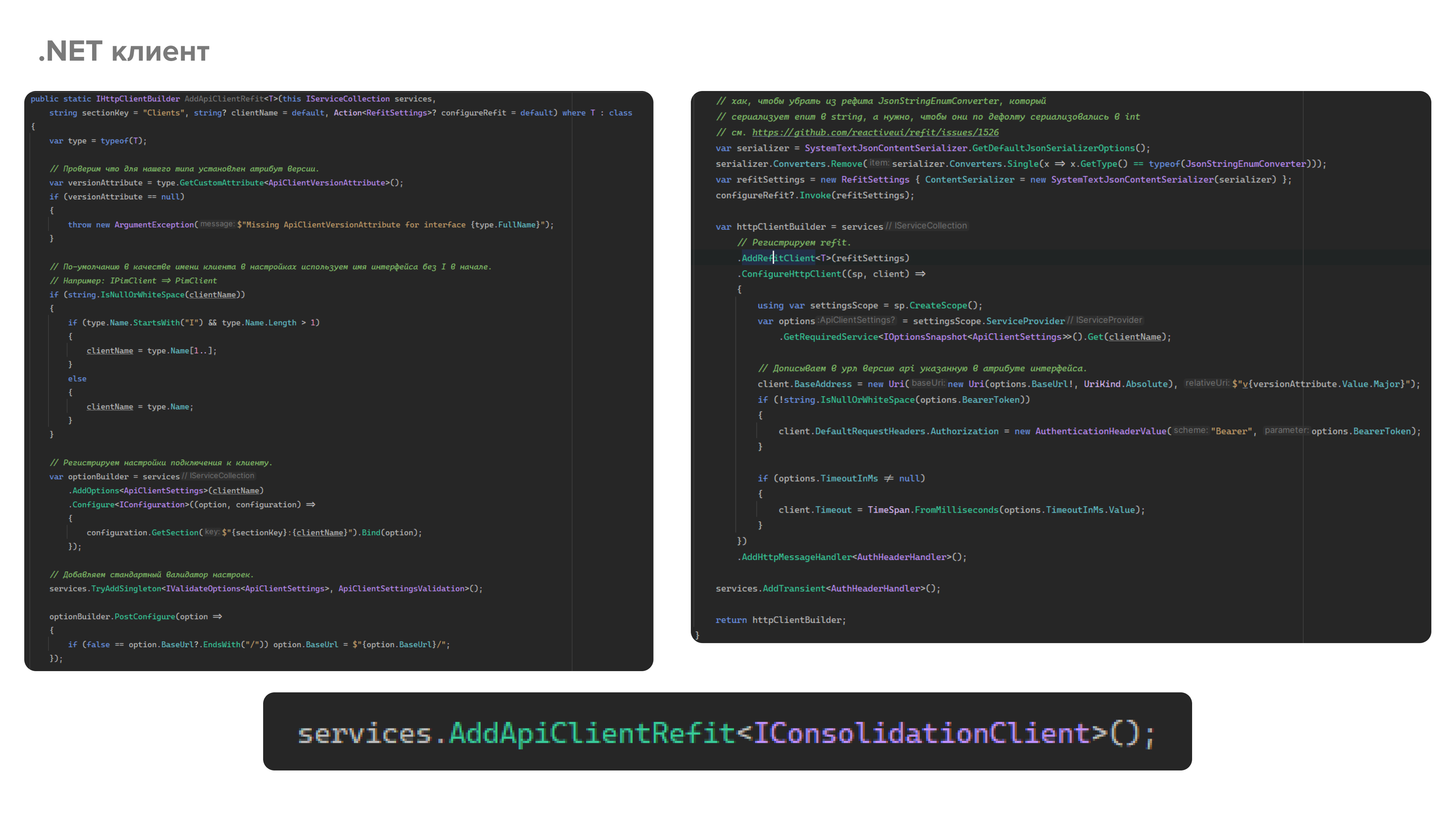 Клиент для API реализуется с помощью библиотеки Refit. Мы написали следующий extension-метод для регистрации API-клиента. В этот метод передаем интерфейс клиента из библиотеки контрактов, а также конфигурационные аргументы, в результате чего в DI контейнере для этого интерфейса регистрируется динамически сгенерированный Refit-ом класс, содержащий вызовы HTTP-клиента.