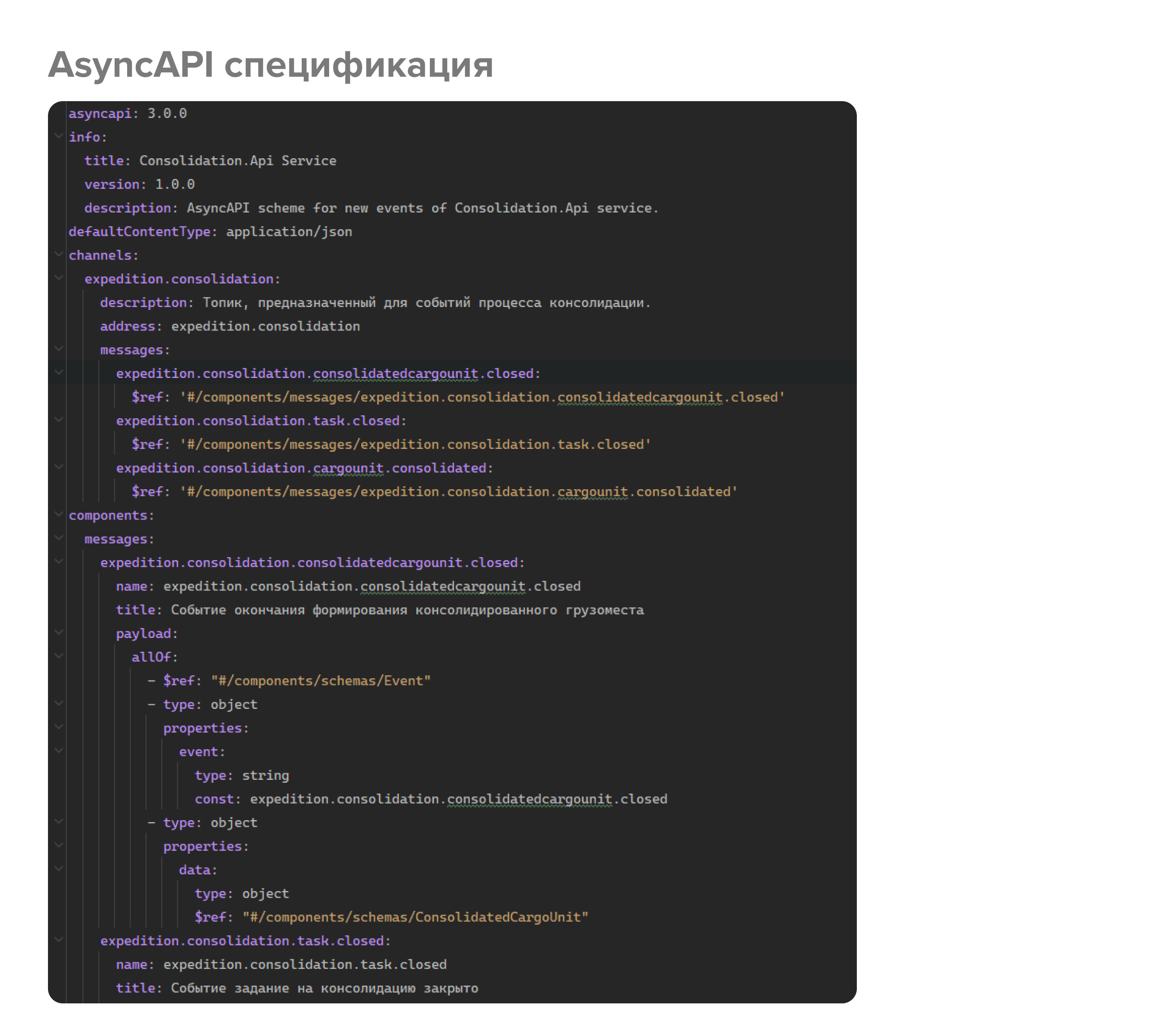 Асинхронная коммуникация микросервисов в нашем случае реализуется через Kafka (брокер сообщений). Здесь мы пишем спецификацию Async API. Это аналогичный стандарт как и OpenAPI, но для описания асинхронного протокола взаимодействия.