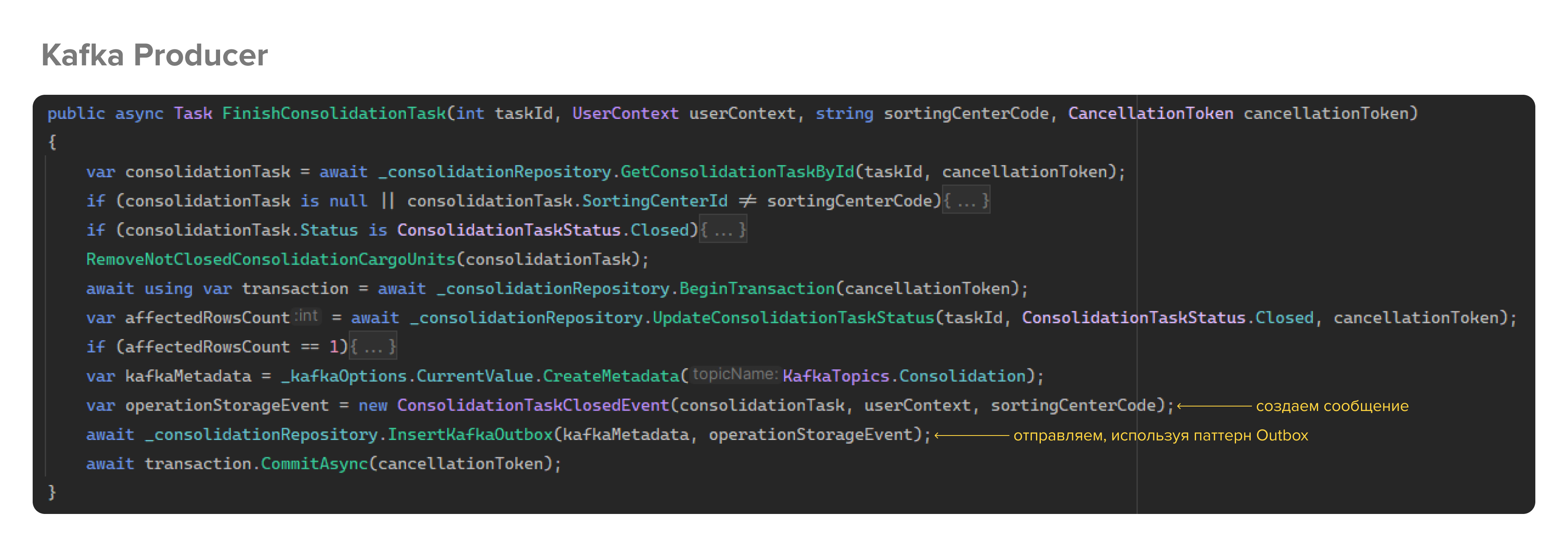 На скрине представлен кусок кода из бизнес-логики, который завершает выполнение таска. Начиная с 5 строки открывается транзакция, в рамках которой в БД микросервиса записываются данные, и дальше три строки отвечают за отправку сообщения в очередь.