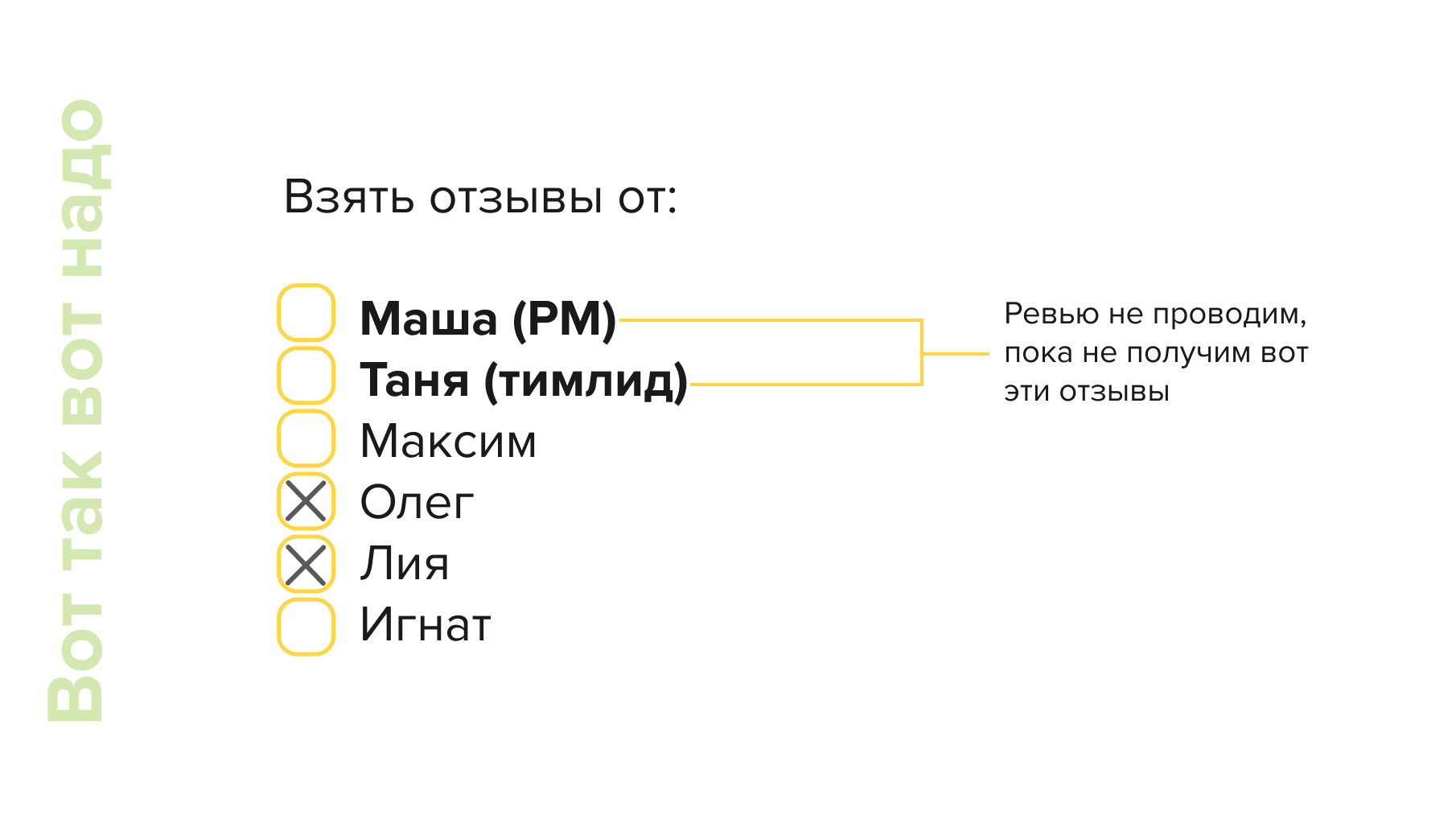 Сотрудник говорит: «Я сделал ABC», а ревьюер ему верит на слово и говорит: «Вот и молодец!».