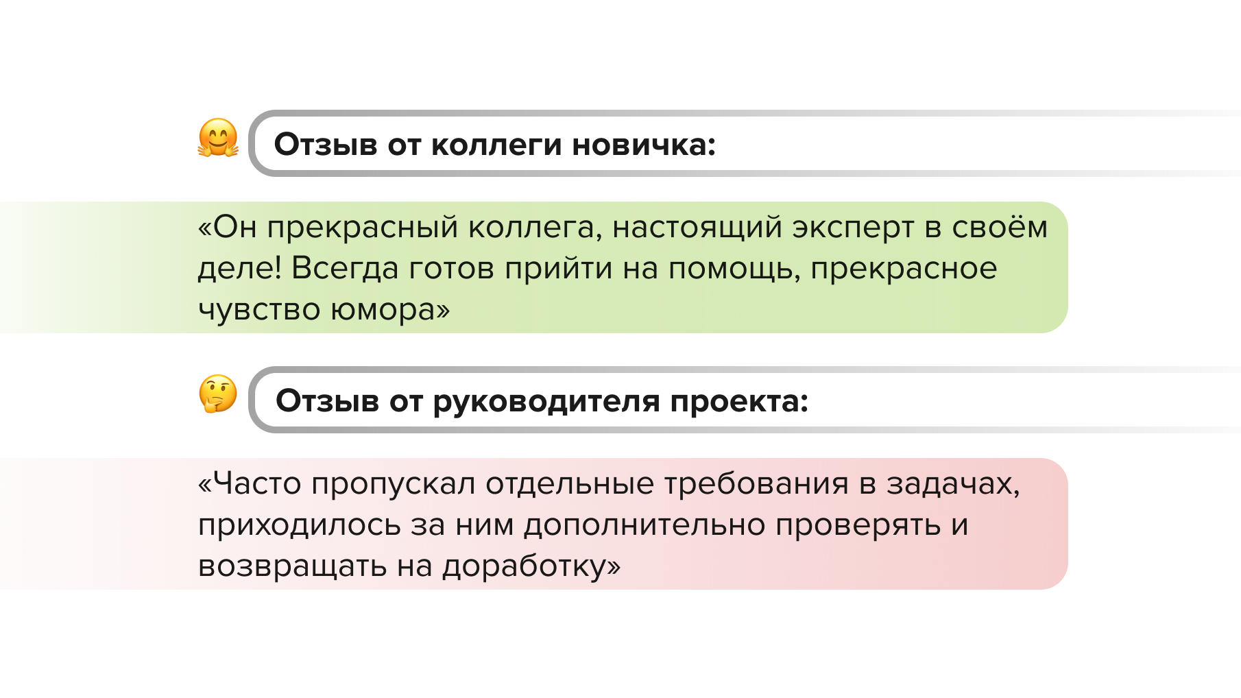 Отзыв коллеги неравен отзыву руководителя проектов. Коллеги чаще не могут оценить, как человек справляется с задачами, ведь сами они задачи не ставят и возможностей для сравнения результатов у них нет.