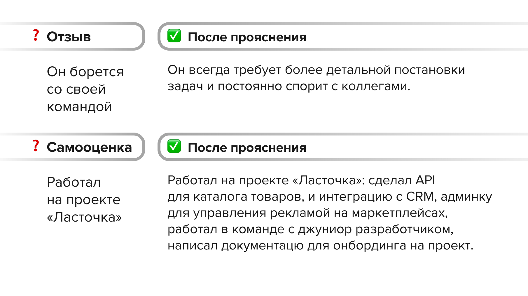 Бывает, что в отзыве или самооценке вроде написано что-то важное, но не очень понятное. На этапе подготовки надо дополнительно такие моменты прояснить: попросить у автора примеры поведения или какие-то дополнительные комментарии.