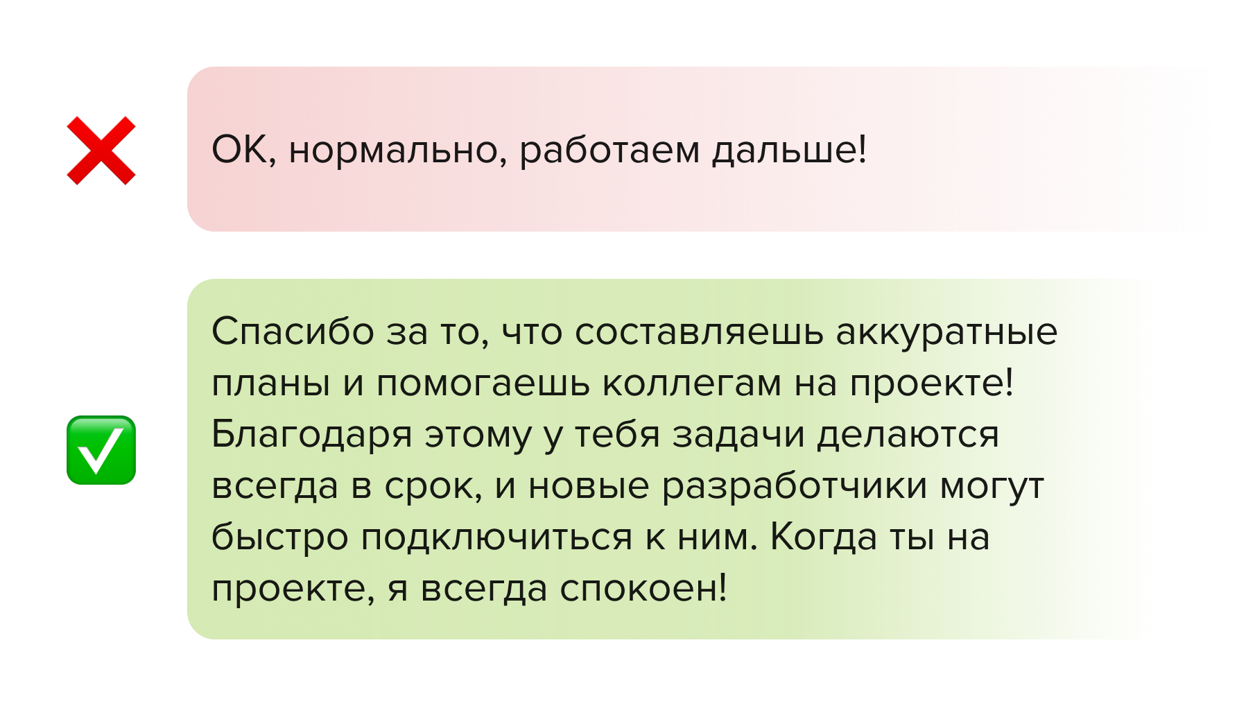 Если не подготовиться к встрече заранее, в лучшем случае придётся на ходу анализировать, формулировать мысли, мычать, подбирать слова. Это криво, непонятно, долго и плохо. В худшем – фидбек по сотруднику будет состоять просто из зачитывания чужих сообщений as is, без анализа и конструктивных выводов.