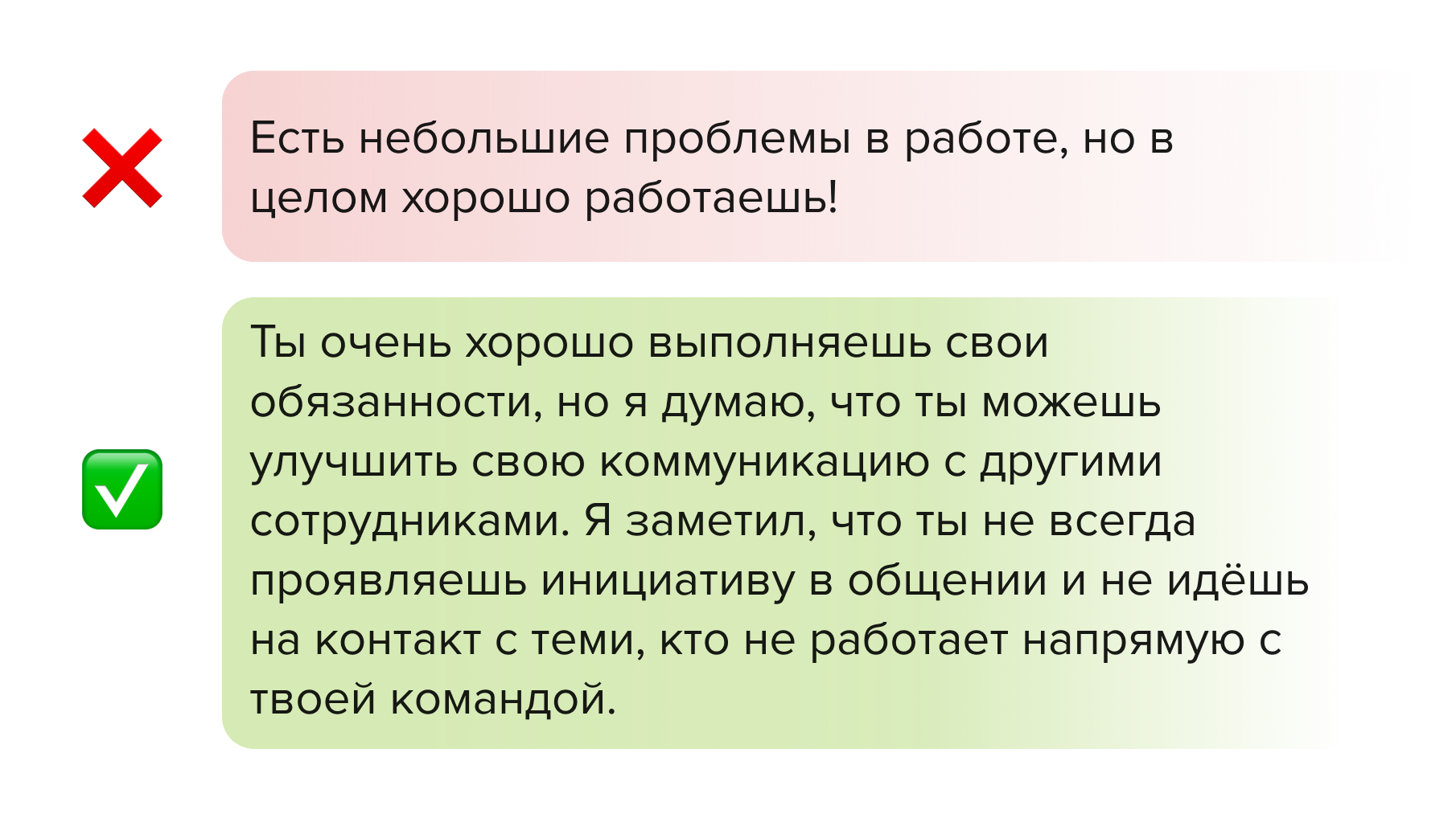 - Ясно и прямо описывает результаты работы или поведение сотрудника, а не личность.