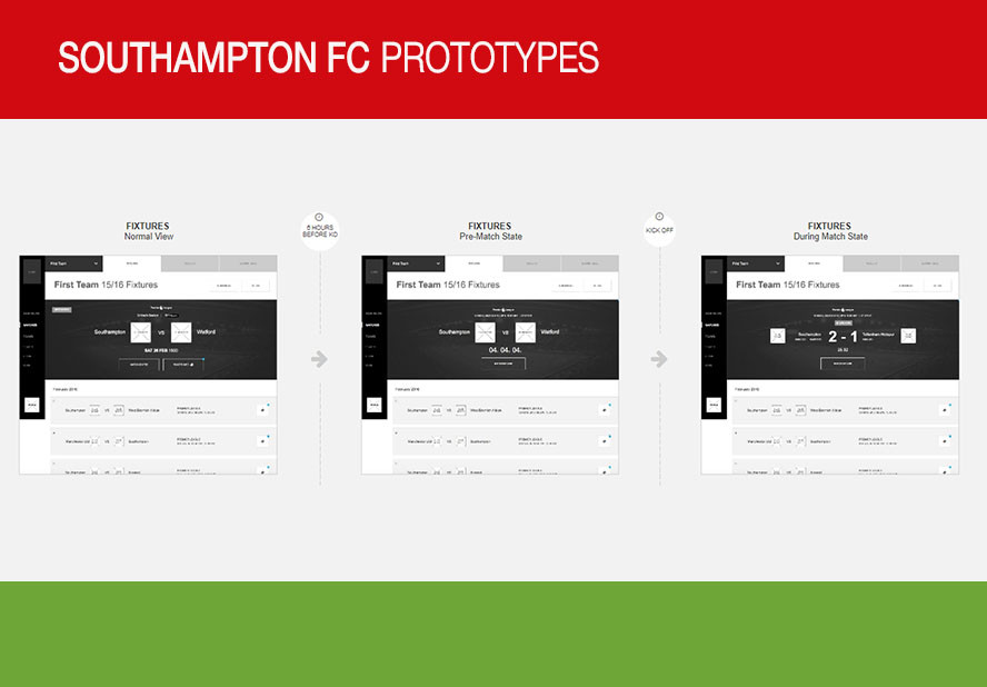 Определившись с основными цветами и шрифтами, дизайнеры Delete создали несколько макетов главной страницы сайта. Расстановка и назначение блоков на них менялась в зависимости от того, в какой момент времени фанат зашел на Southamptonfc.com — перед матчем, во время или после.