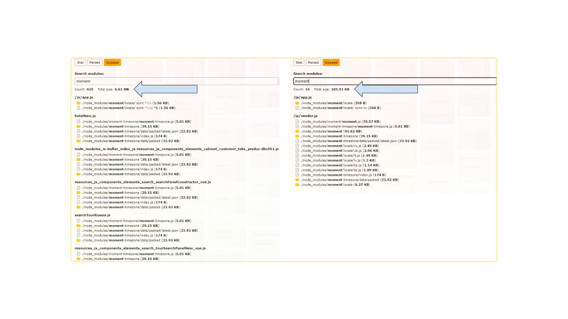 На нашем проекте проблема чрезмерной величины JS бандлов была связана среди прочего с применением пакета moment. Это библиотека, позволяющая упрощать работу с датами и временем через определенные методы. Это тяжелая и устаревшая библиотека, которую рекомендуют заменять на более легковесные аналоги, например, dayjs.