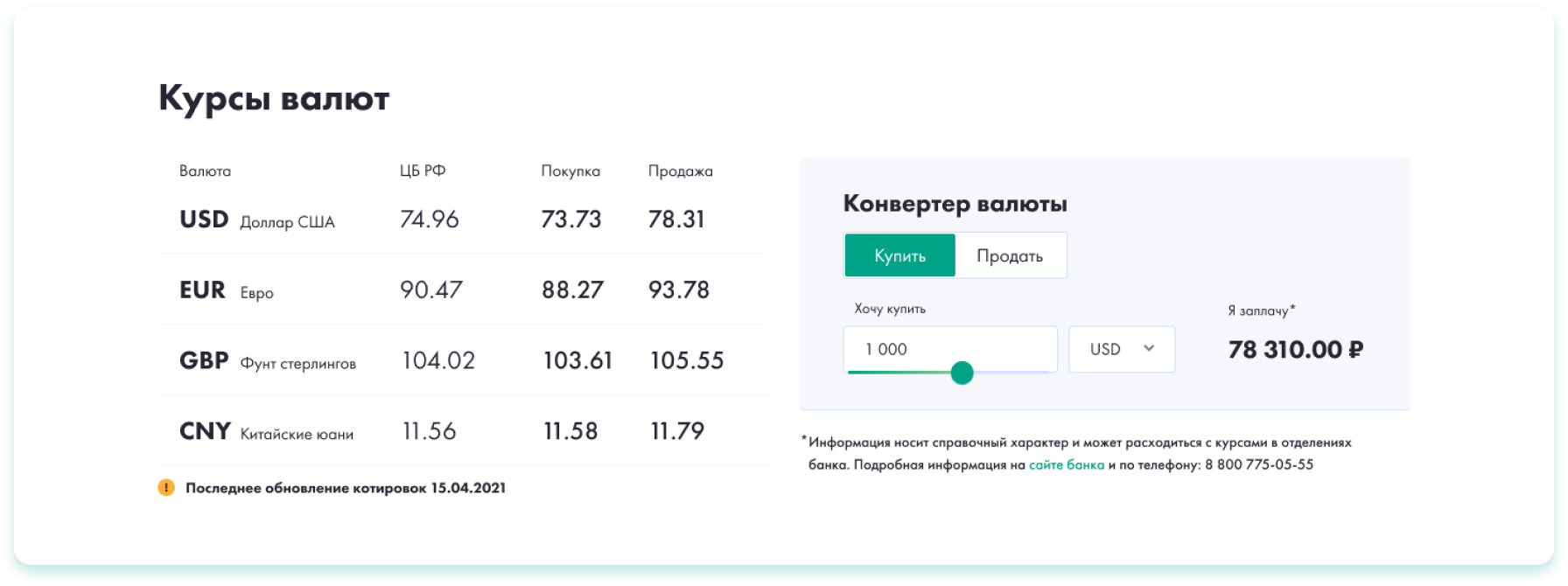 Дополнили блок с курсом валют конвертером: пользователь указывает сумму, которую он хочет купить или продать в валюте, и сразу видит, сколько это будет в рублях.