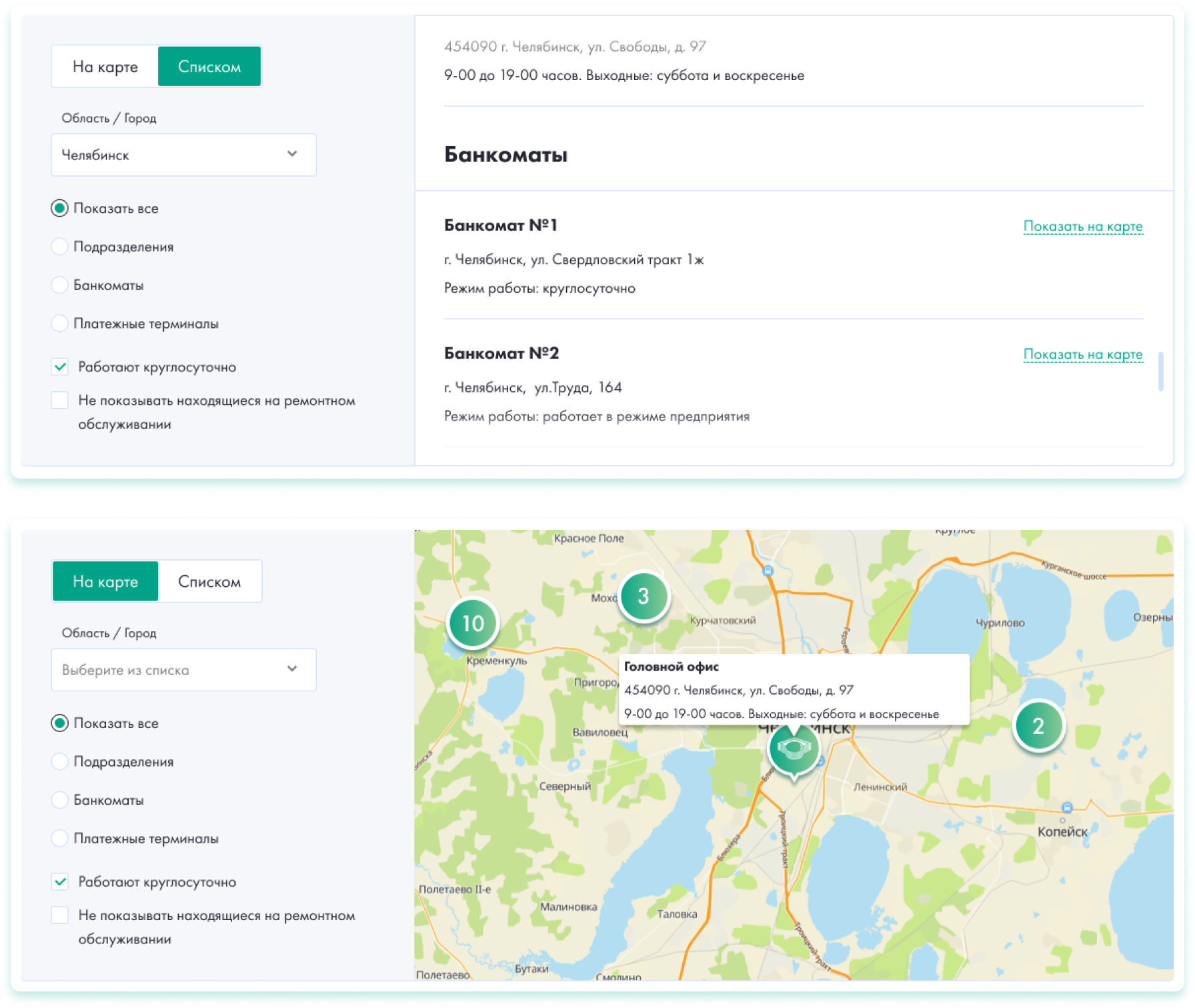 Обновили карту подразделений банка. С помощью фильтров можно, например, выбрать только банкоматы с круглосуточным доступом, и убрать из списка те, что находятся на техническом обслуживании.