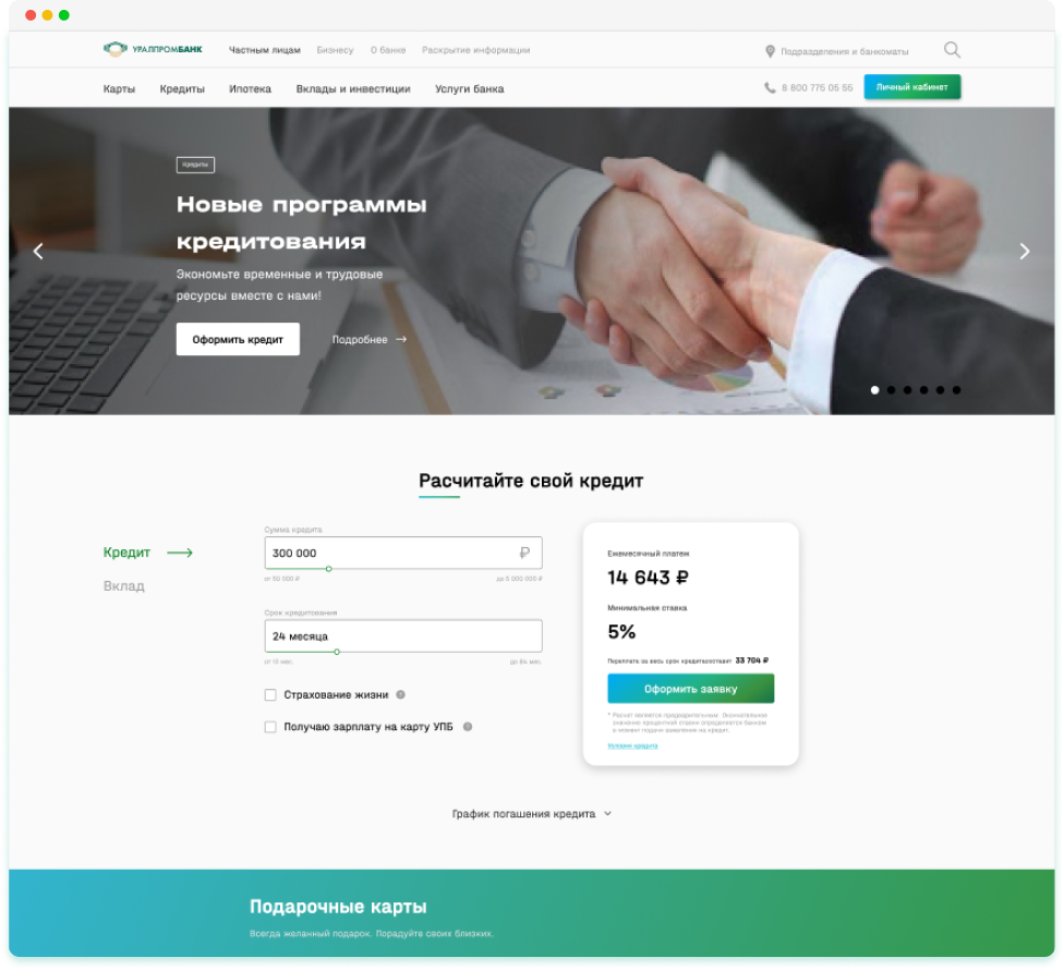 Чтобы помочь клиенту добиться этих целей, мы должны были полностью обновить сайт «Уралпромбанка» — технически, логически и визуально: